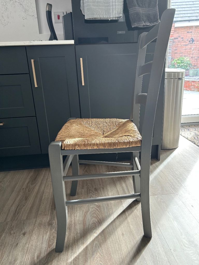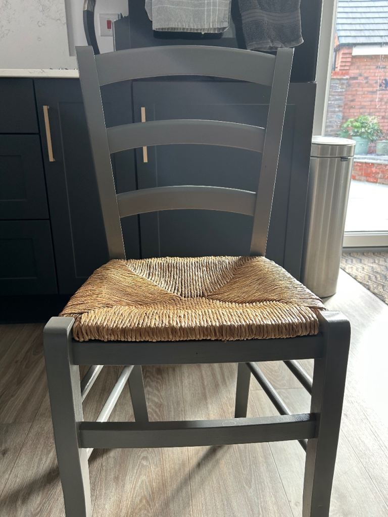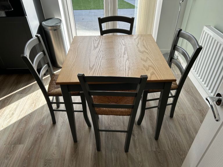 Grey table with light wood top 85cm square. Four grey chairs with wicker seats. Good quality, bought from John Lewis.