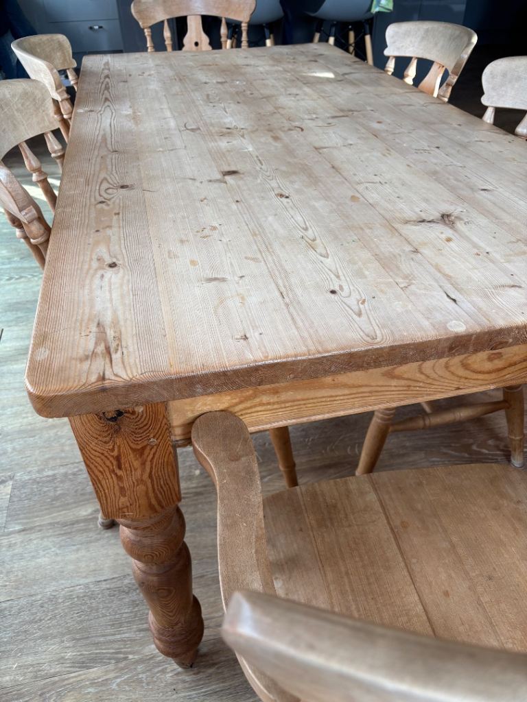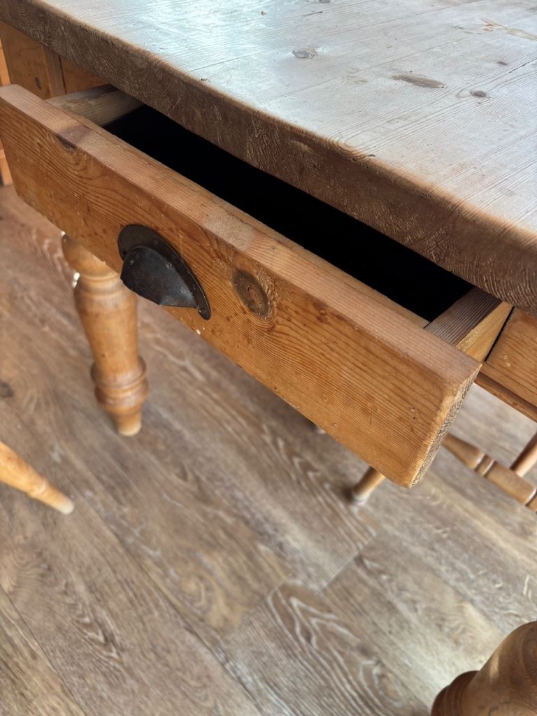 Solid rustic pine farmhouse kitchen style table. Small end drawer.