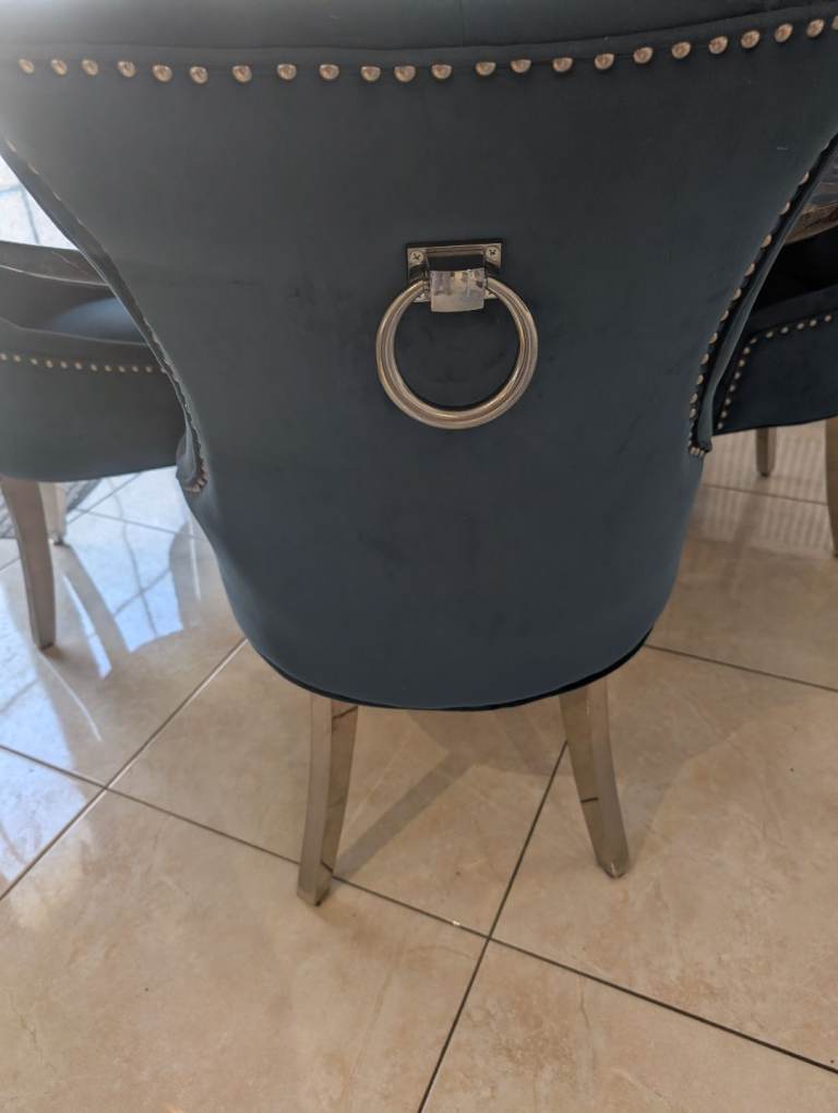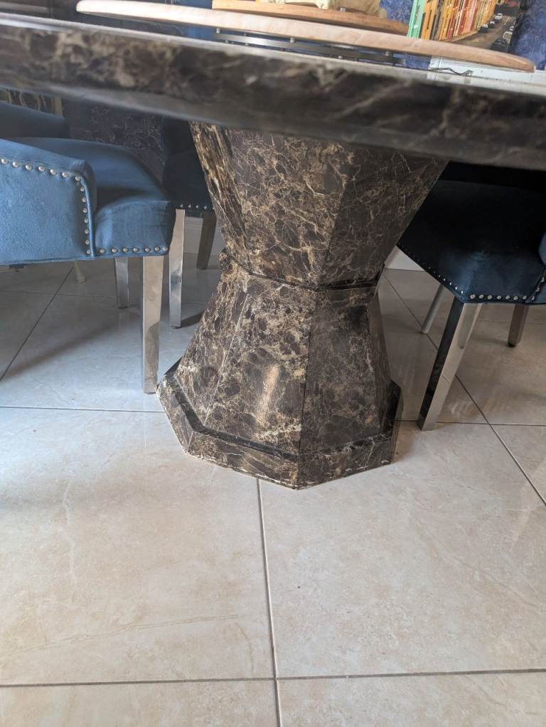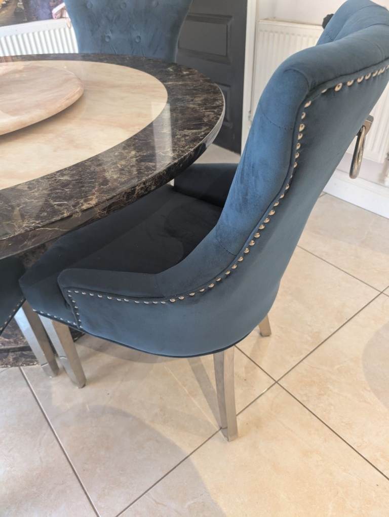 Large marble table and 6 velvet chairs very good condition table heavy no damage chairs all in very good condition no damage french blue in colour