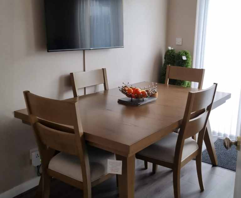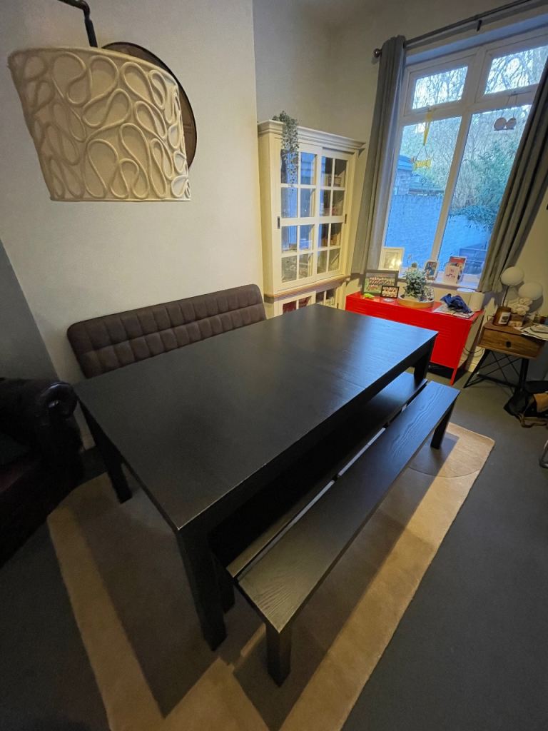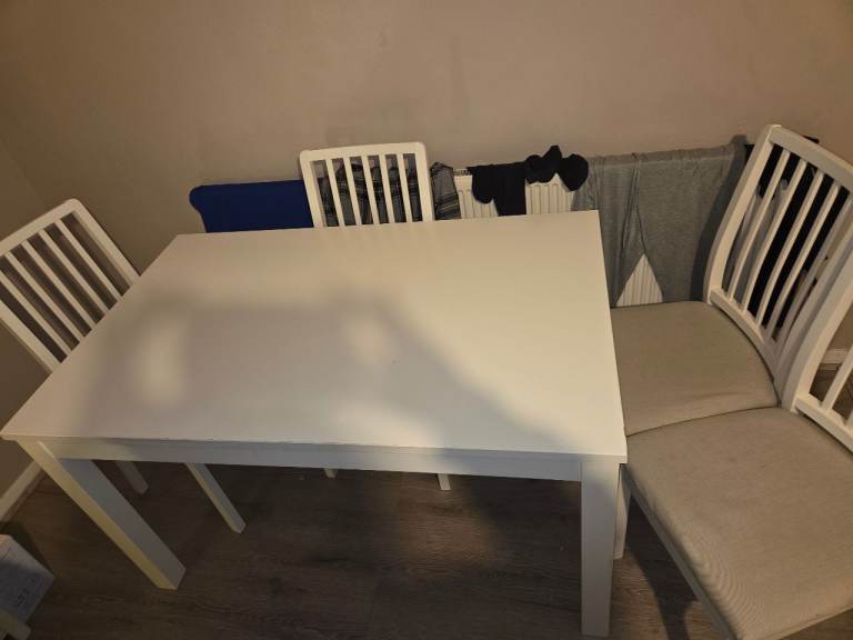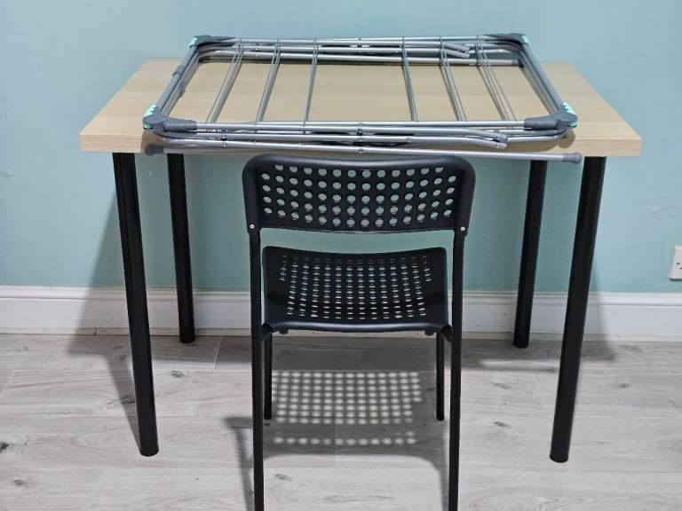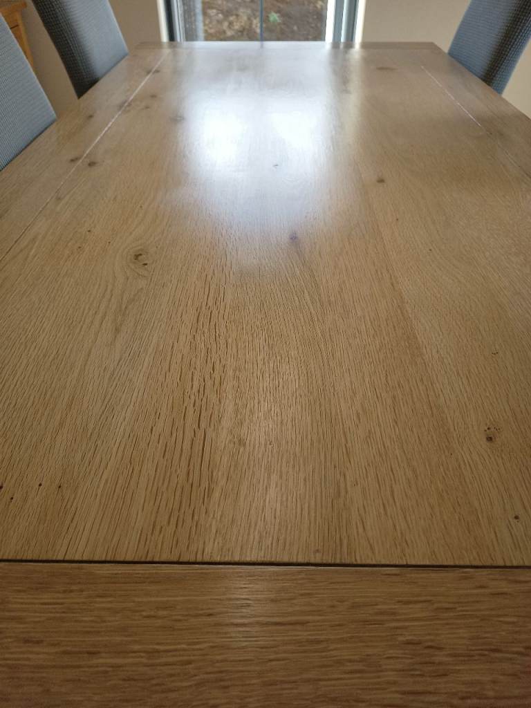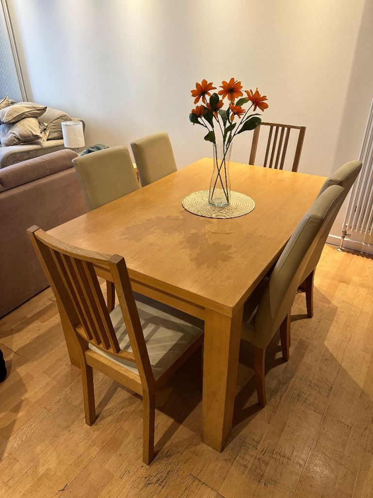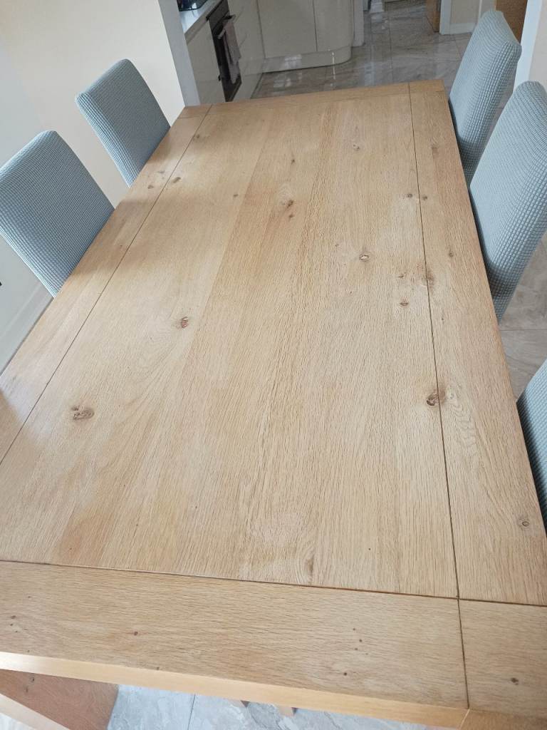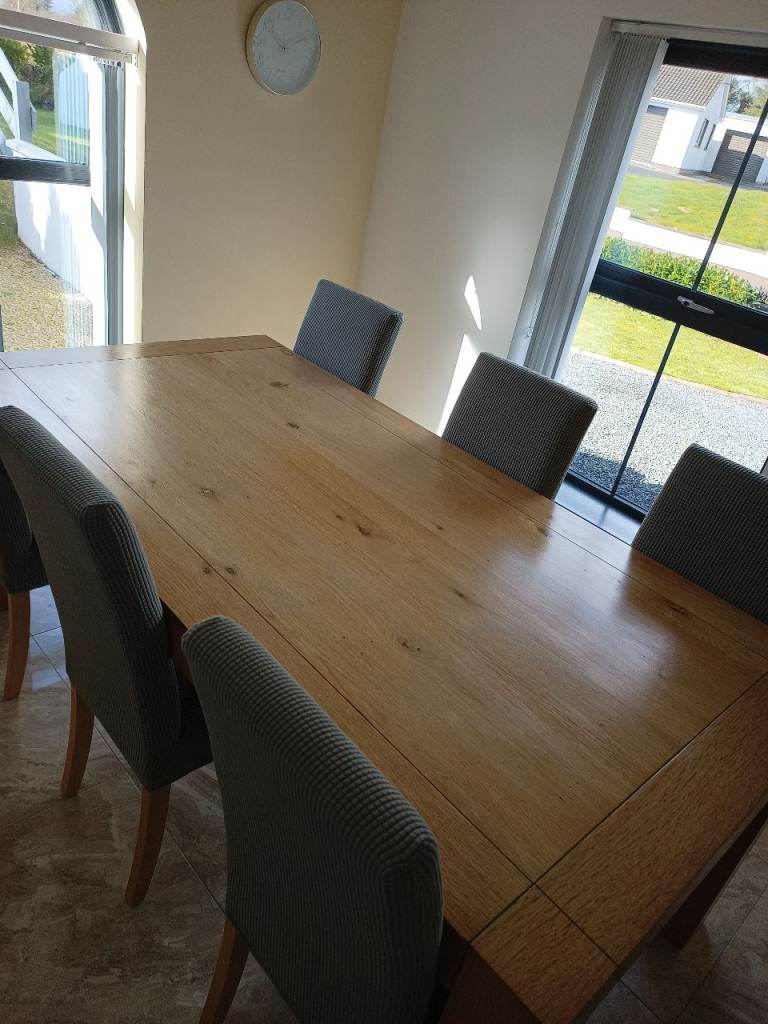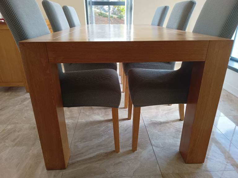 Solid oak dining table and 6 chairs, all in excellent condition.