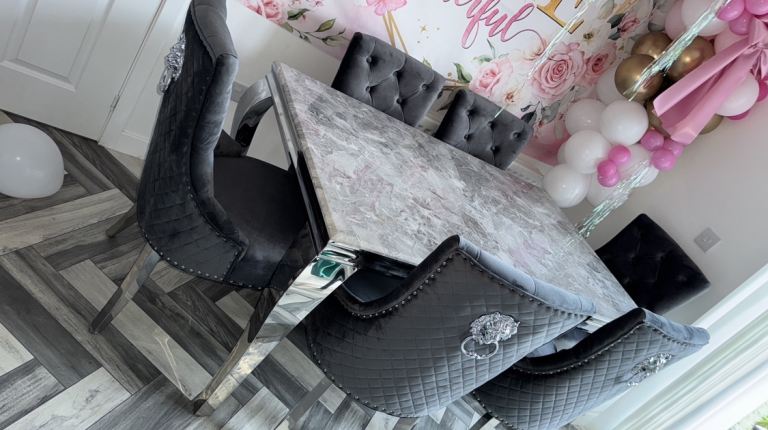 6 chairs included in sale but table is large enough to accommodate 8 chairs, if necessary.