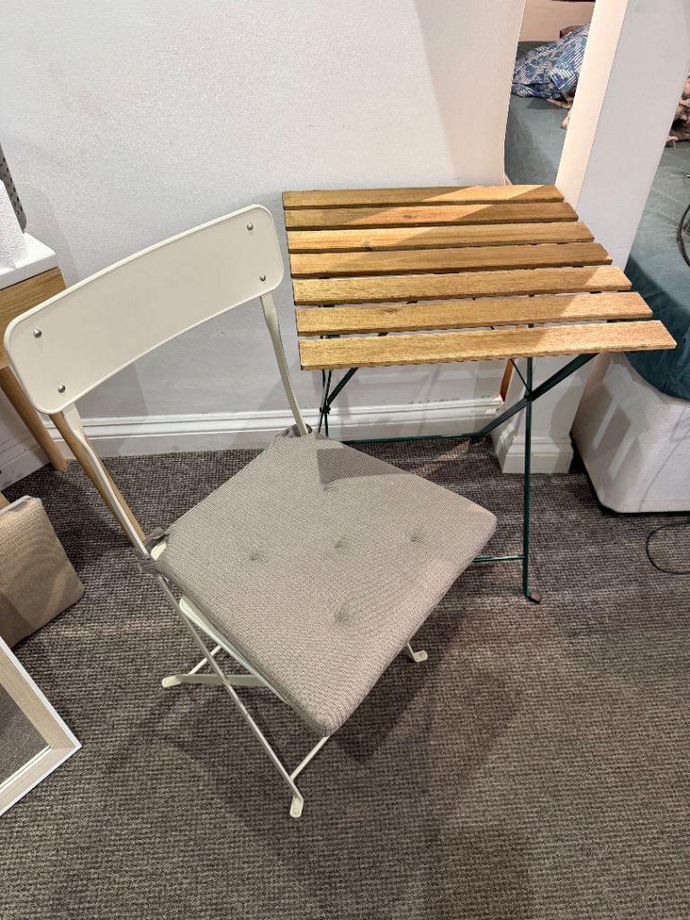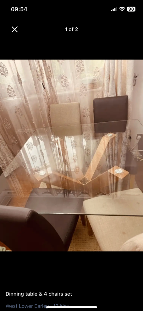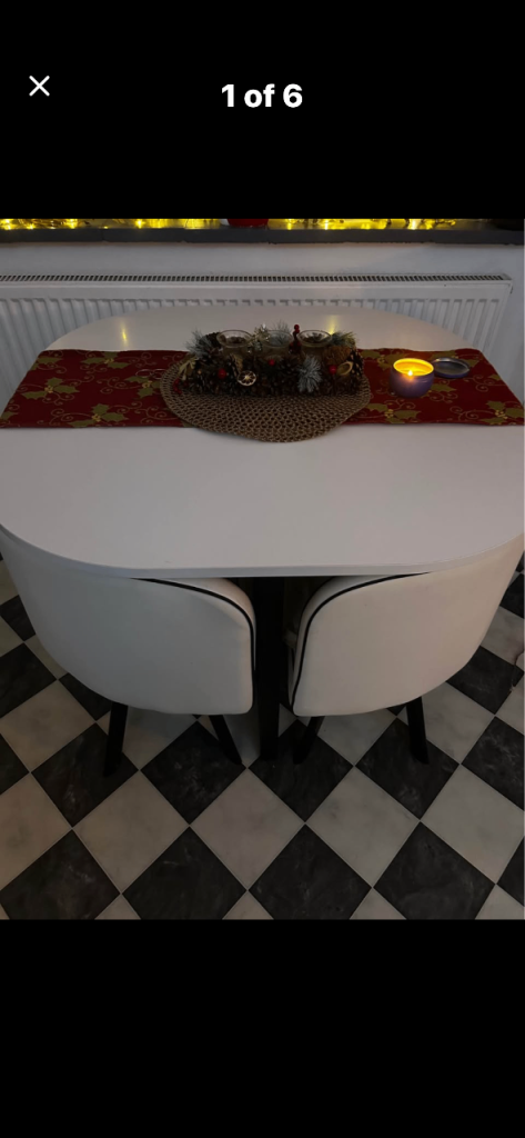 1980 drop leaf dining table with six reproduction chippendale chairs. Made from Mahogany with grey leaf seat covers. Table size folded down 920mm x 620mm a good size for a smaller dining room and able to seat 6 people when exstended. Good condition table top always been covered nice shine no scatches.