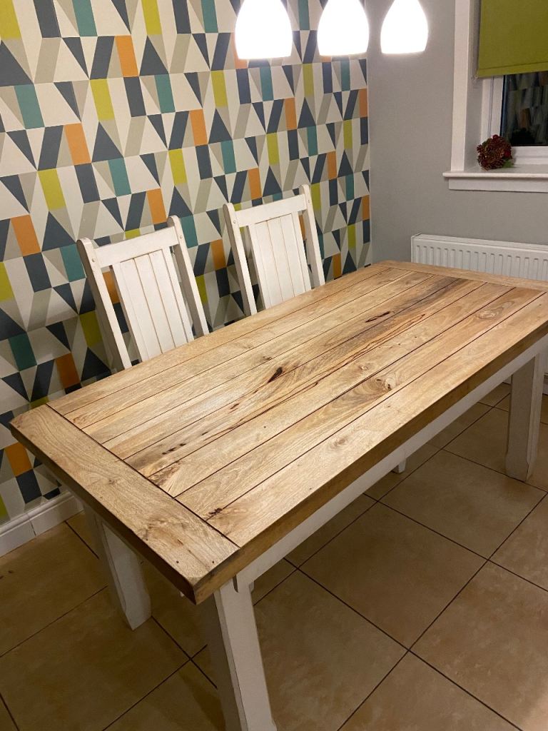 Shaker-style mango wood dining table, 175cm long with 6 matching chairs. Distressed painted legs and chair backs. Table too requires a bit of TLC. Pick-up only.