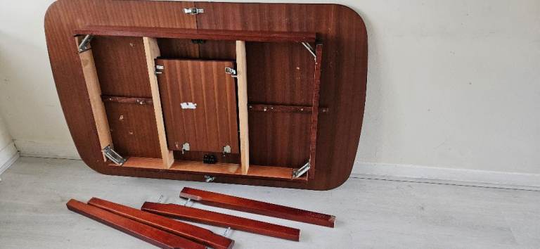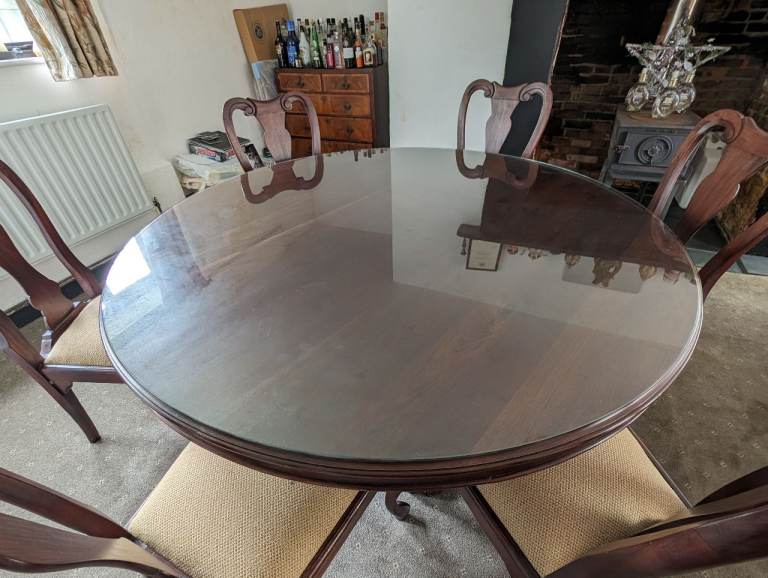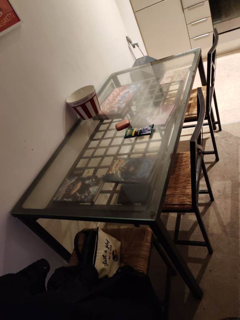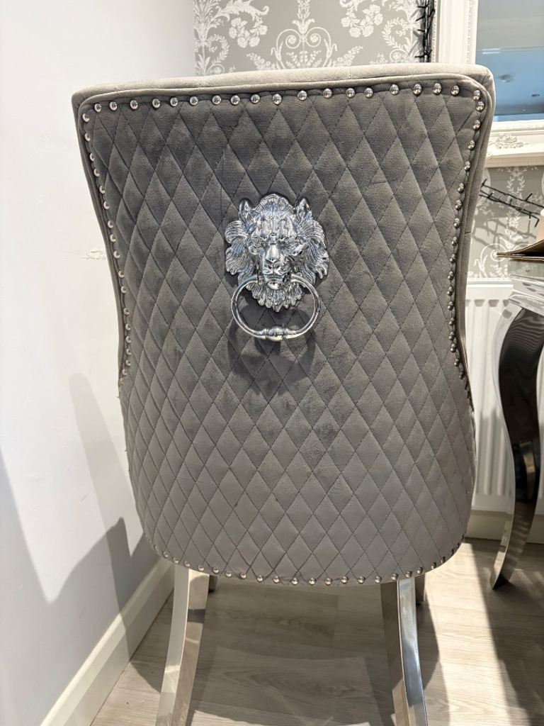 Table length 180cm width 80cm height 76cm is marble effect and very heavy will require 2 strong people to move. Comes with 6 chairs all grey with silver knockers on the back. Chairs could do with a clean as are dusty from being stored and used by children but no permanent marks or damage.