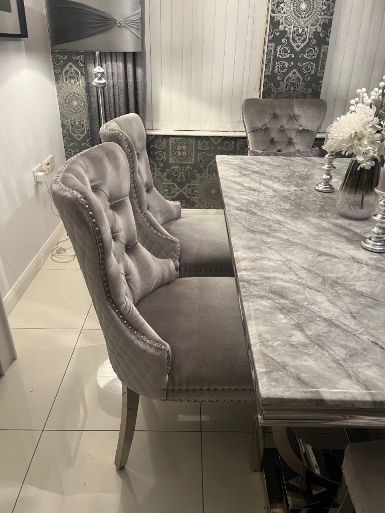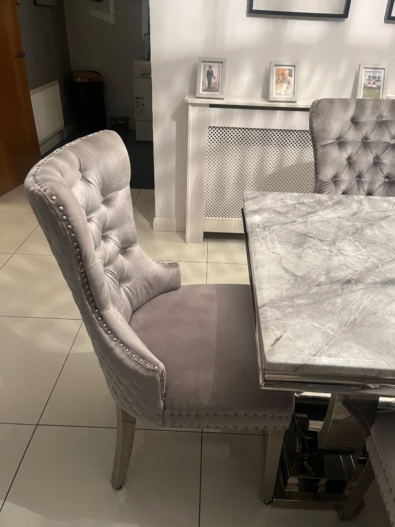 Marble table 6 grey velvet chairs very good order only reason for sale I’m down sizing