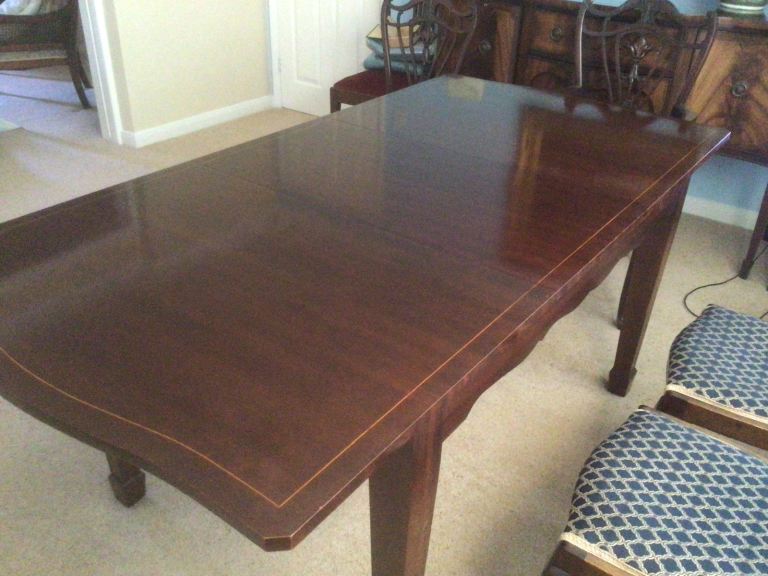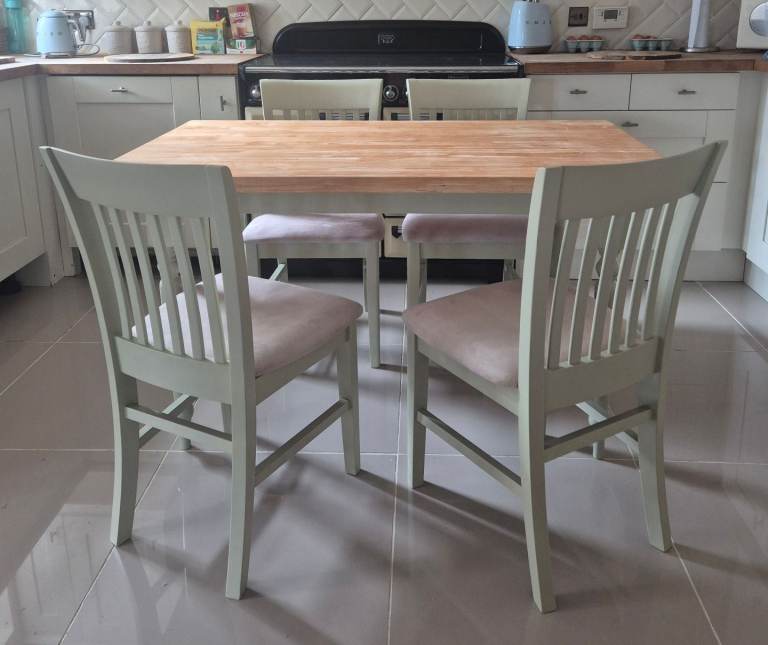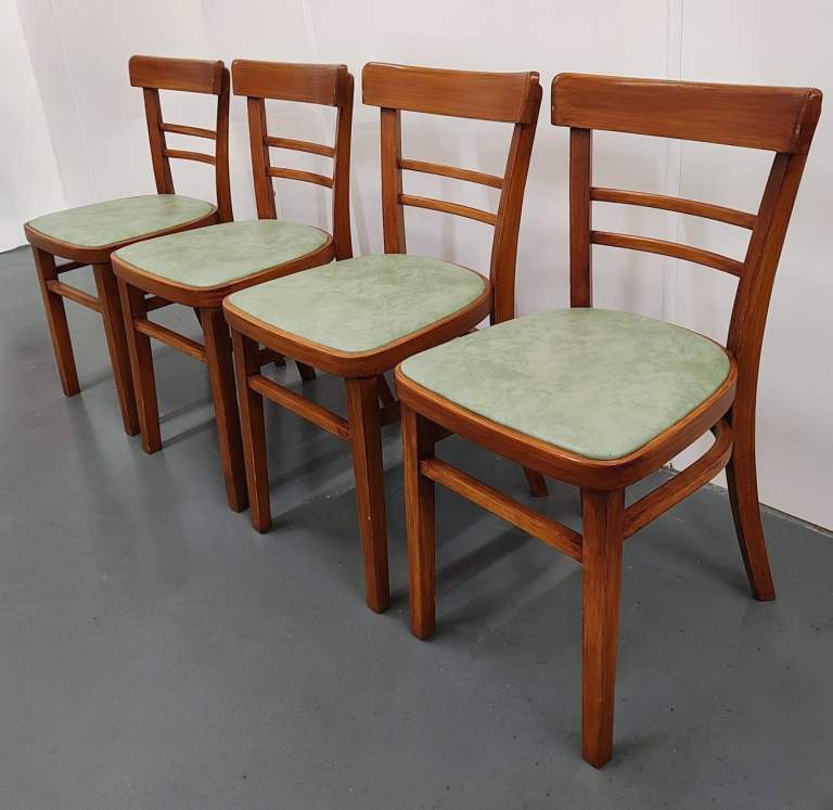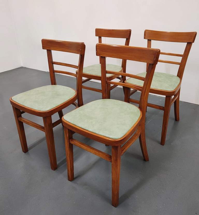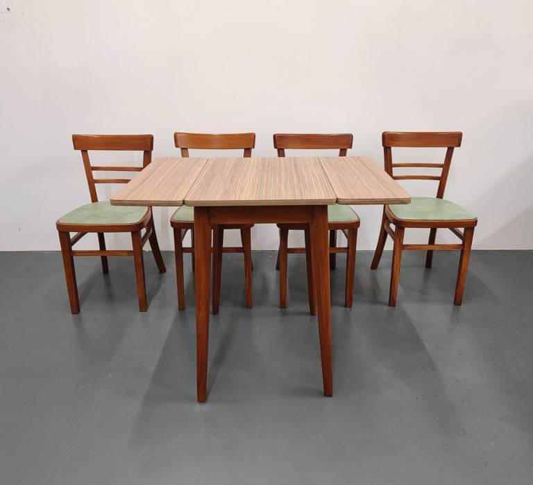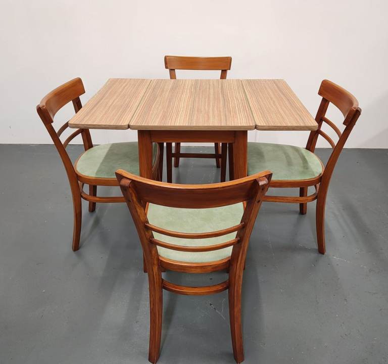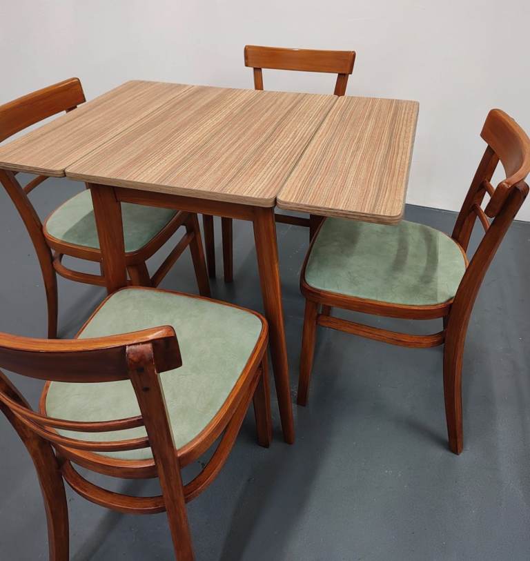 Mid-century Wooden drop leaf dining table with four matching ladder-back chairs with green upholstered seats and laminate table top.