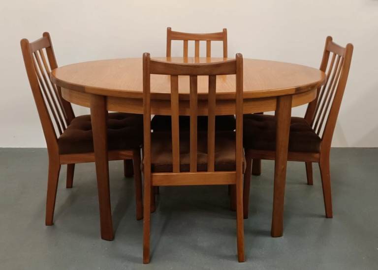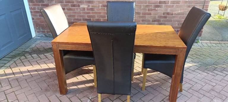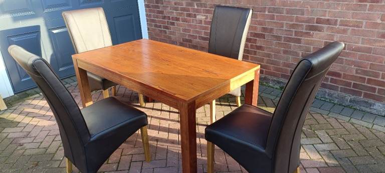 For sale a top quality modern and stylish solid wood dining table with Four matching high back Brown leather dining chairs , there are a couple of minor scratches on the table surface and a couple of minor age related marks on the chair but overall in excellent clean condition from a smoke and pet free home.