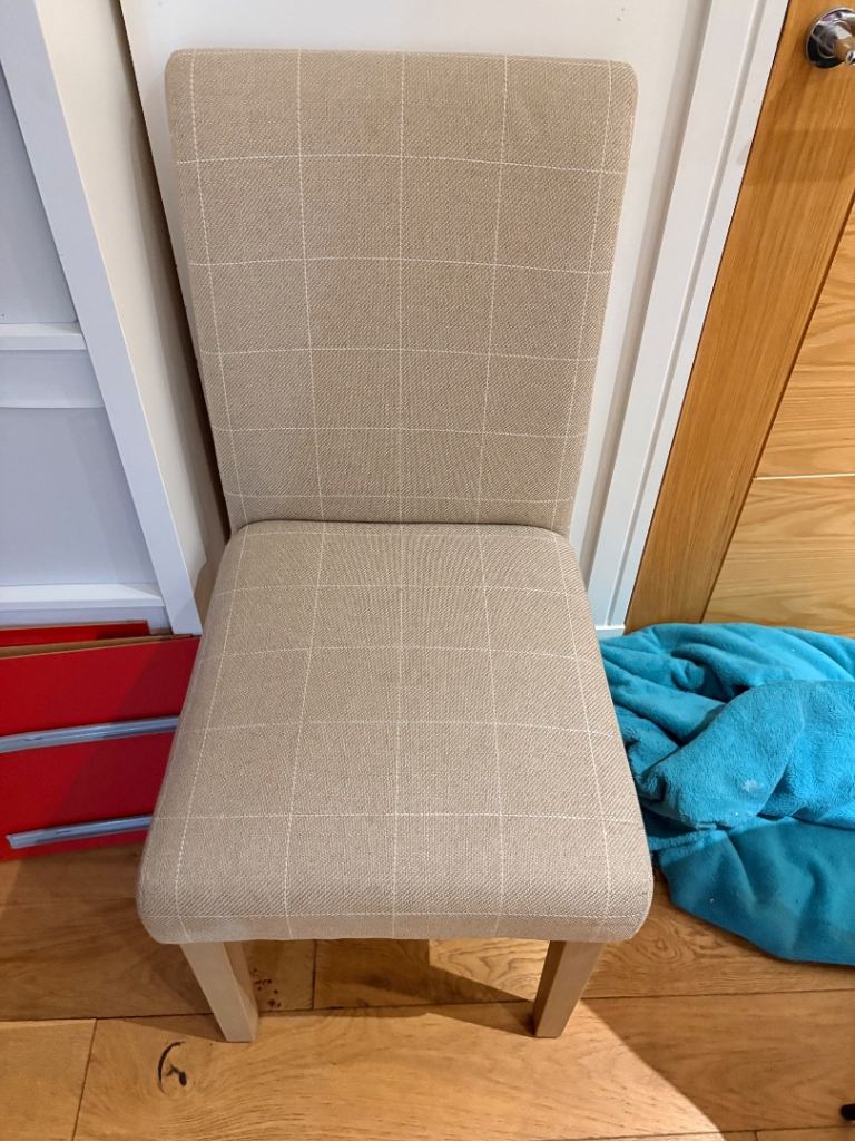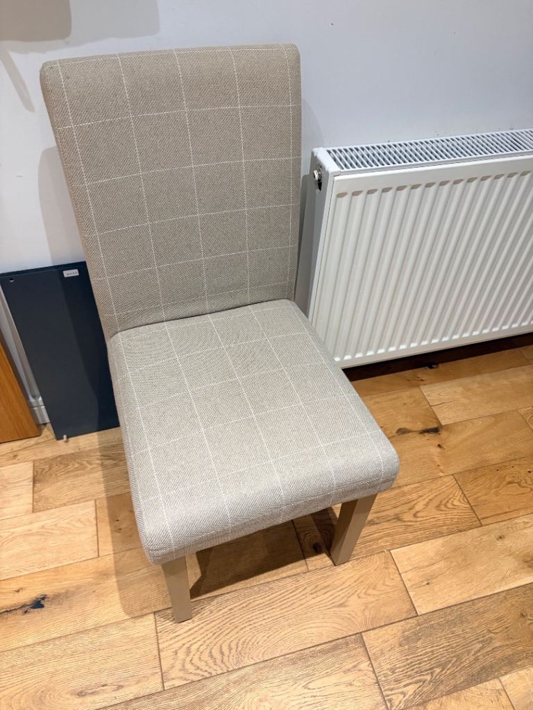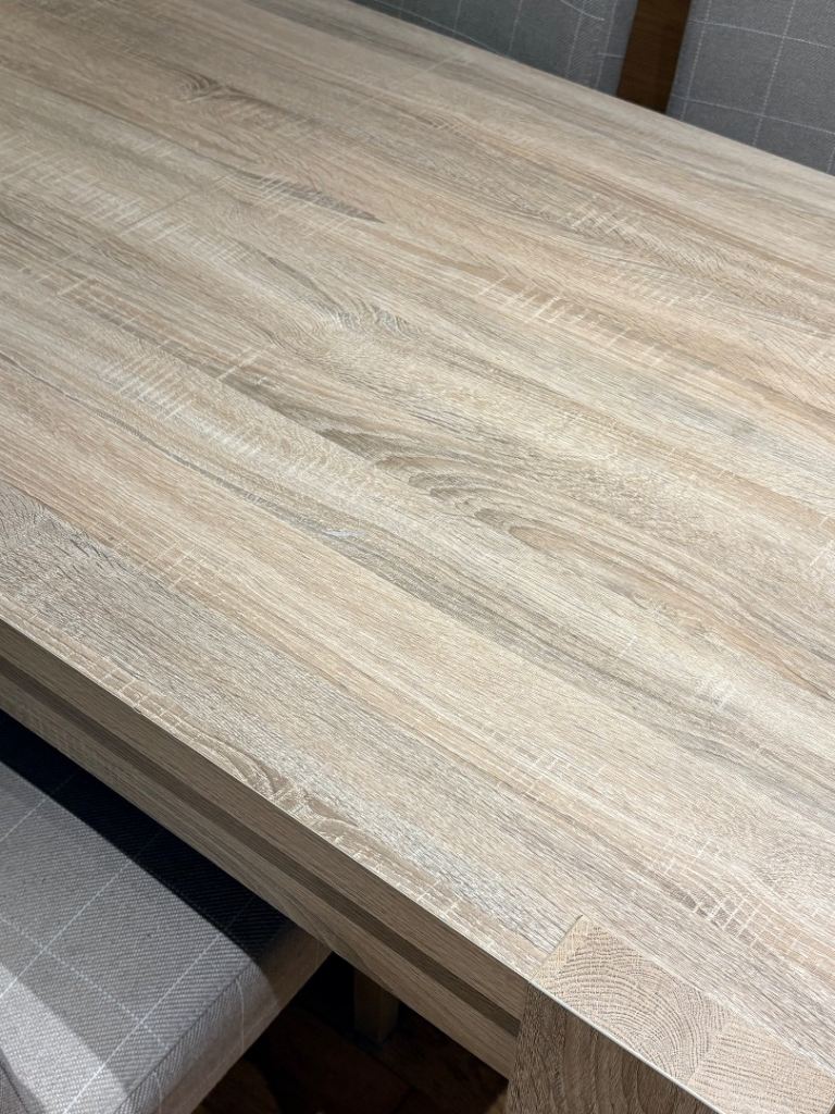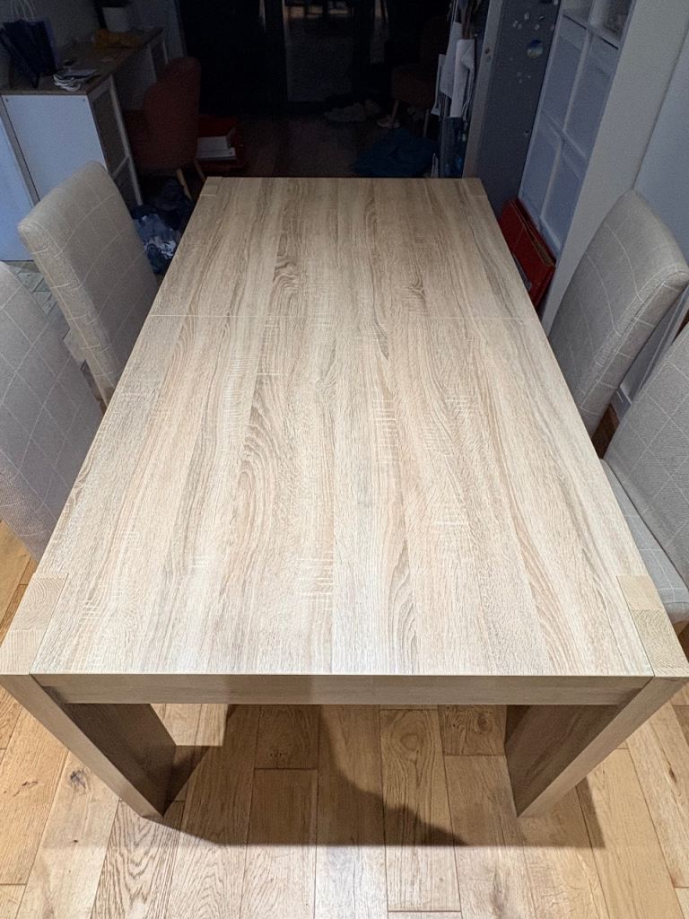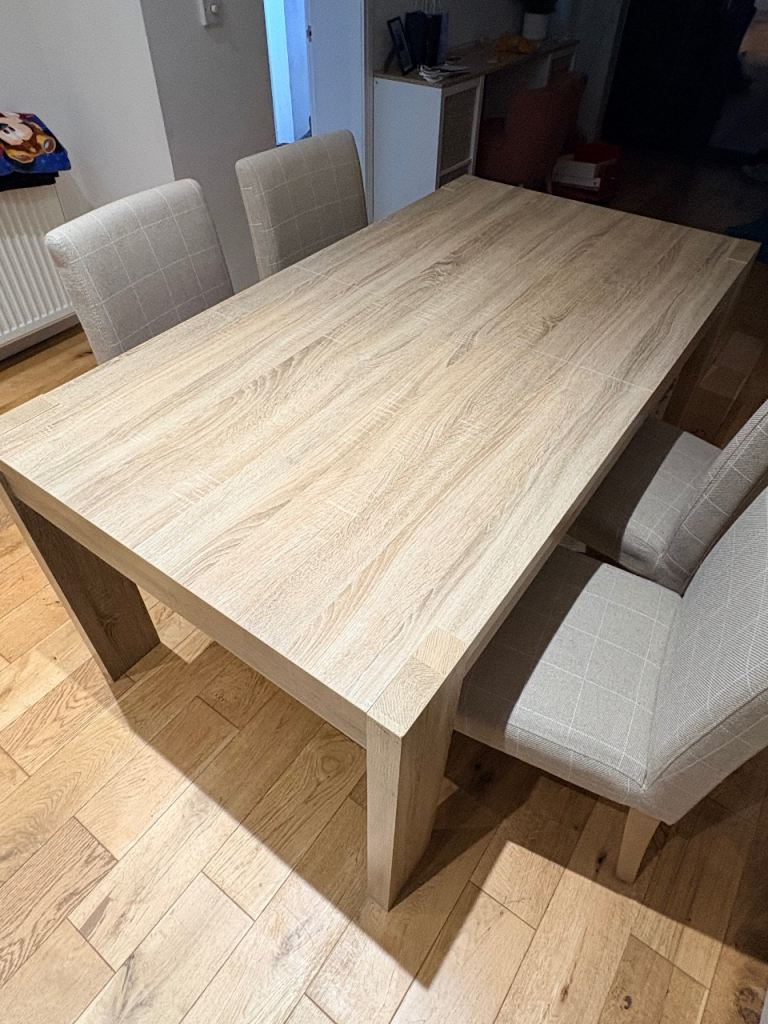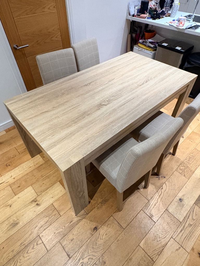 Next solid wood dining table and 4 matching chairs. Extends from 6 seater to 8 seater with leaf that is stored inside. Chairs have some marks that would come out with a steamer and table has a scratch on the surface and some faded pen marks that are barely visible.