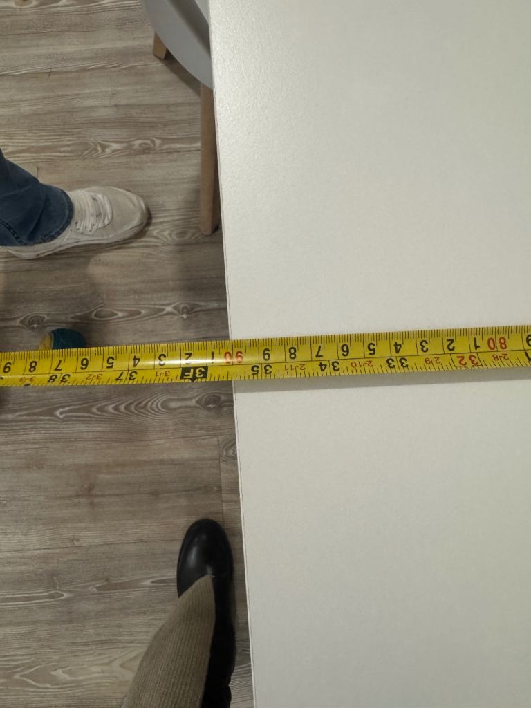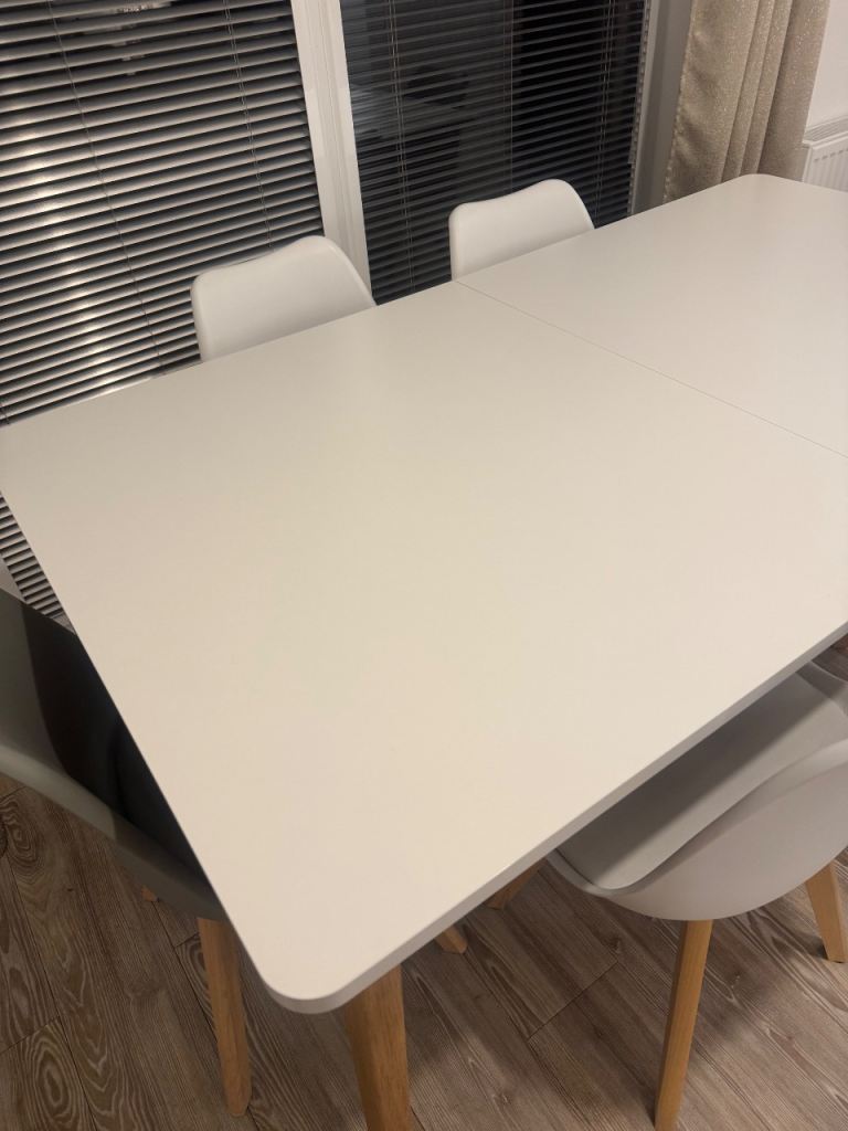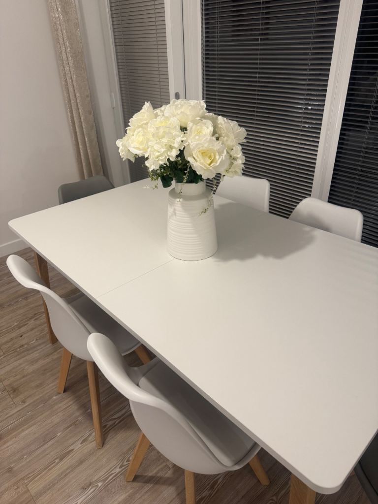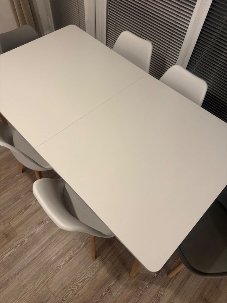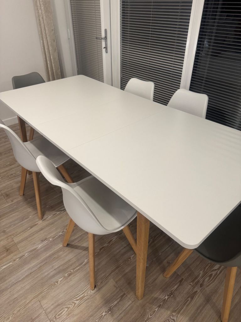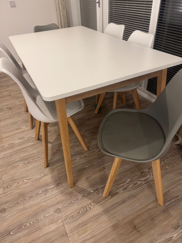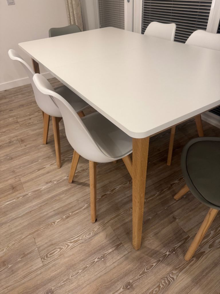Perfect condition white and oak table and 6 chairs. 4 white and 2 grey.