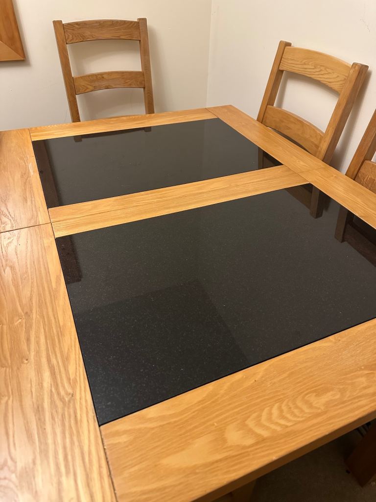 Posting for 2+ yearsOak and black marble extendable dining table and chairs