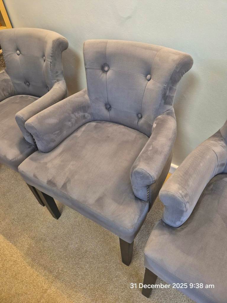 • Style: 8 premium Windsor "Knocker Back" chairs in plush grey velvet.