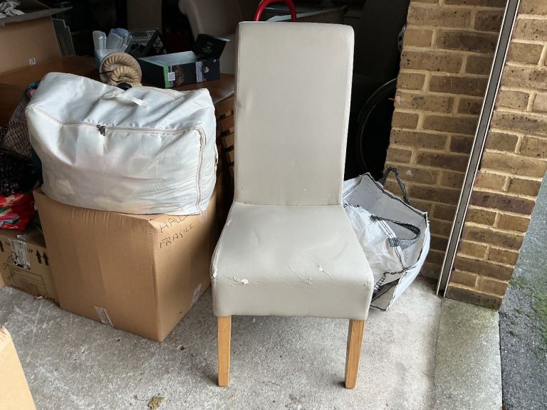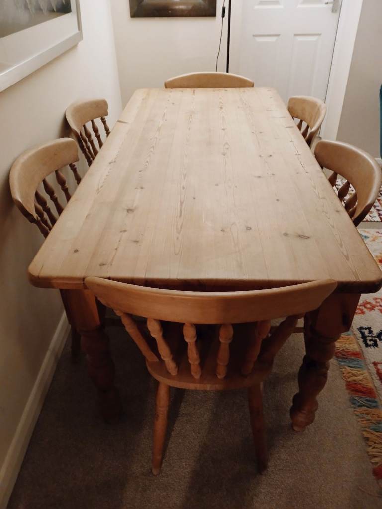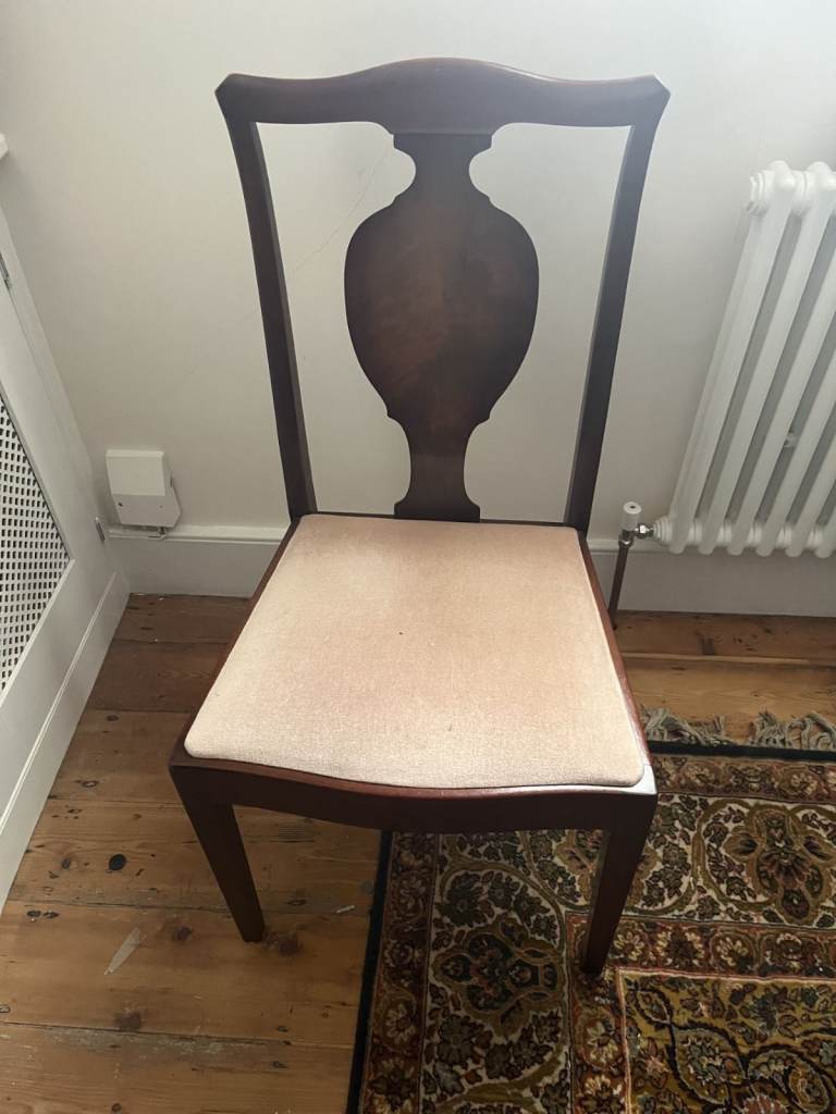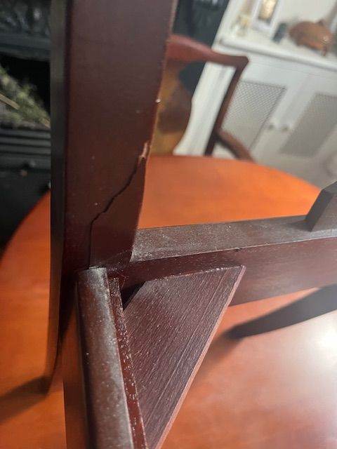 Good overall condition. Some age-related wear to the tabletop, including slight variation in the finish visible in certain lighting, plus a crack to one chair. All reflected in the price and does not affect use.