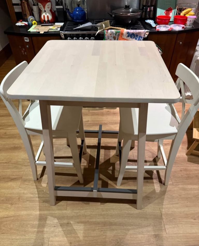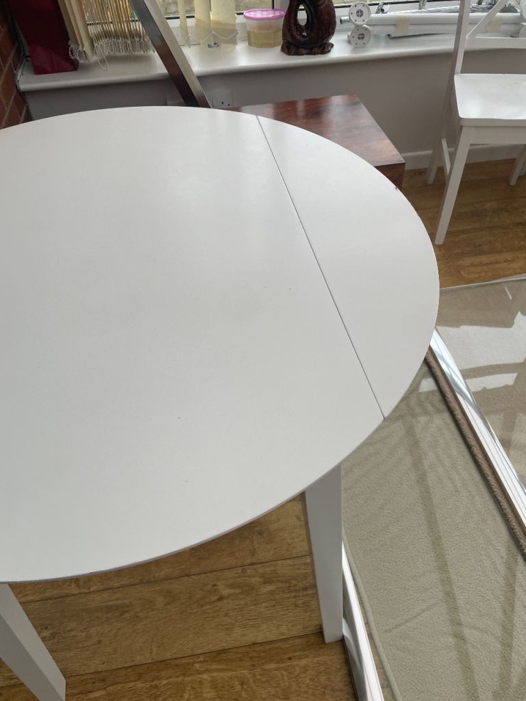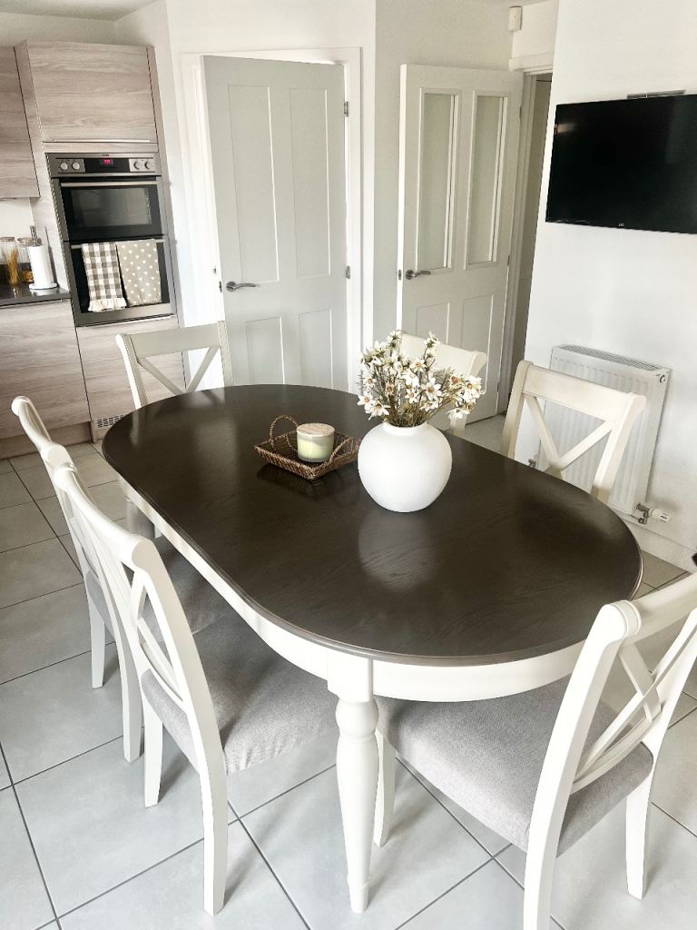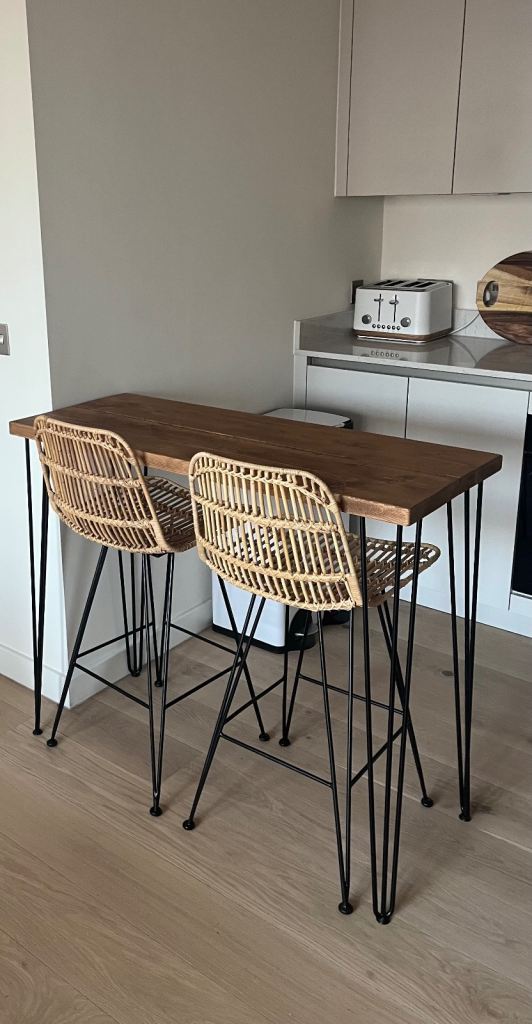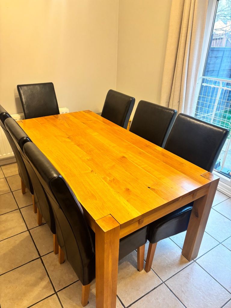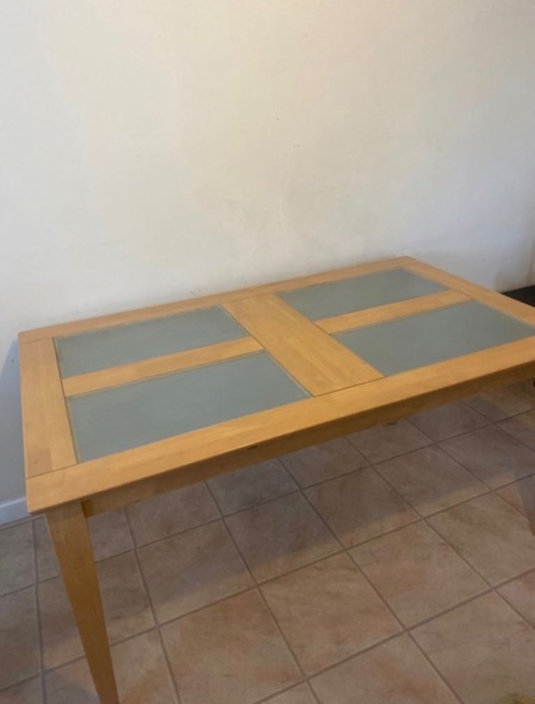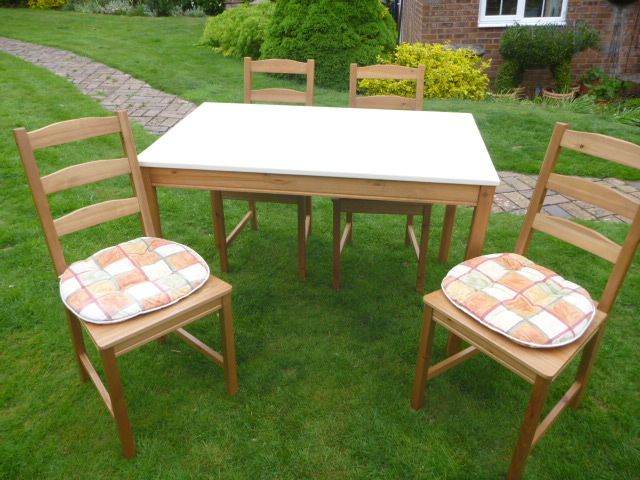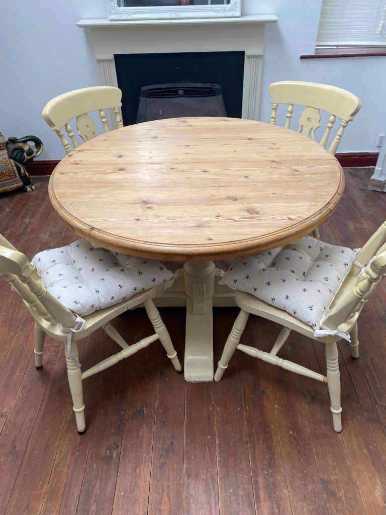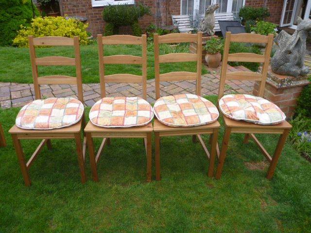 Comes with 4 pine dining chairs, again in excellent condition. All stable and do not wobble with separate seat cushions. Chairs can be positioned either side by side or one on each edge.