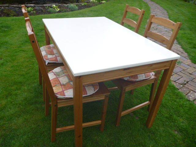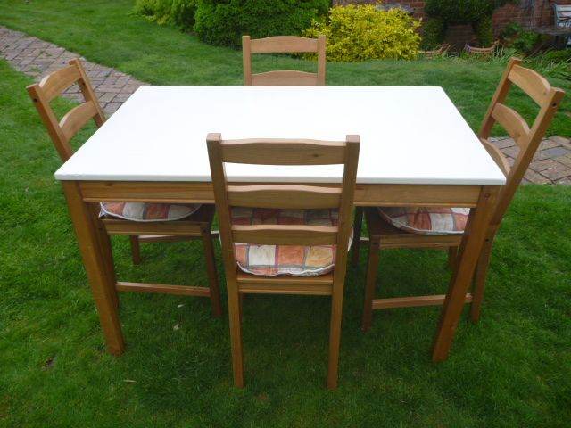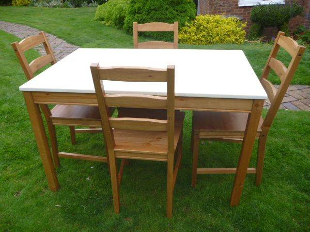 Pine Dining Table with Cream Top + 4 Chairs with Cushions in VGC