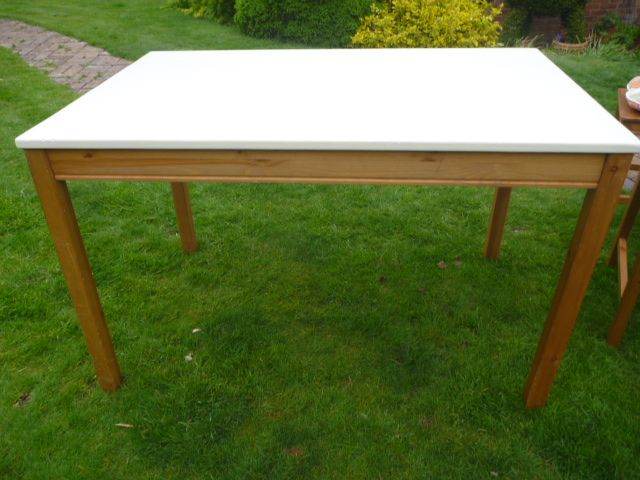 A lovely little solid pine dining table measuring 75 x 120 cm, with a cream top, In very good condition and the table legs can be removed for transport.