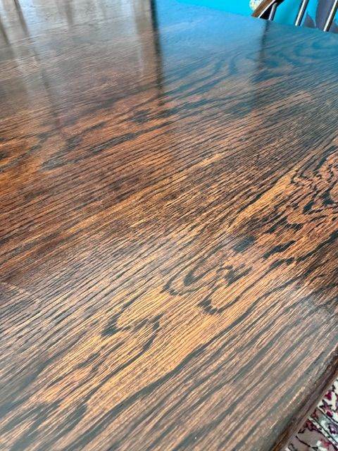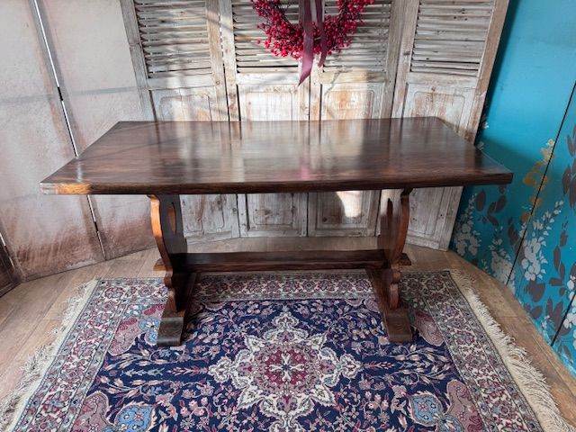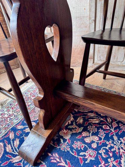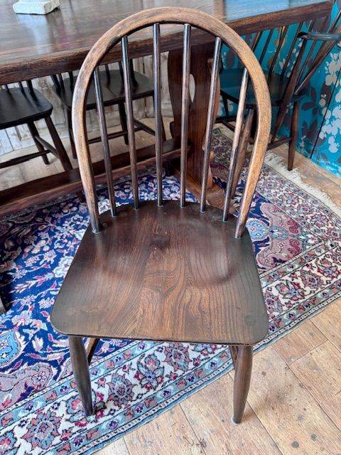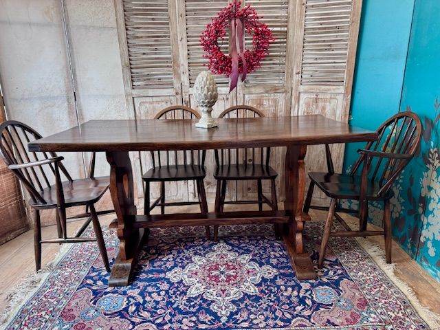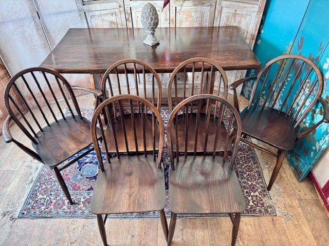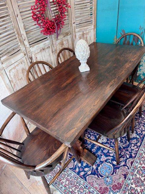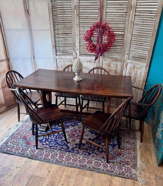 Gorgeous Mid Century dark solid oak refectory dining table with four spindle back chairs and two arm-chairs.