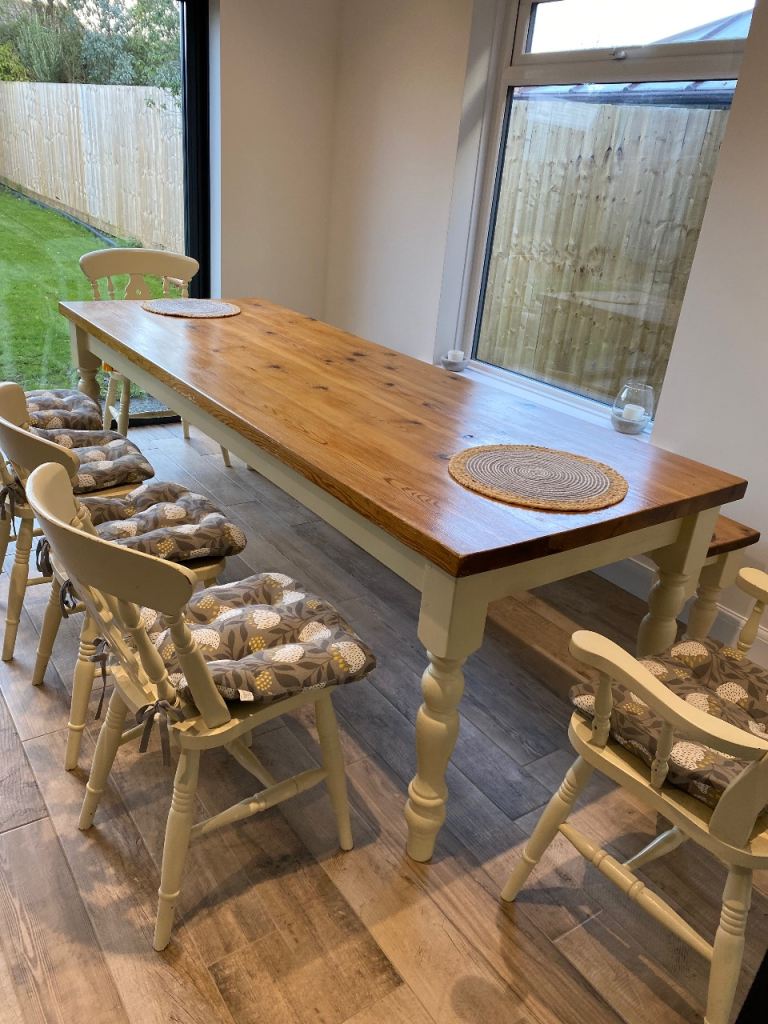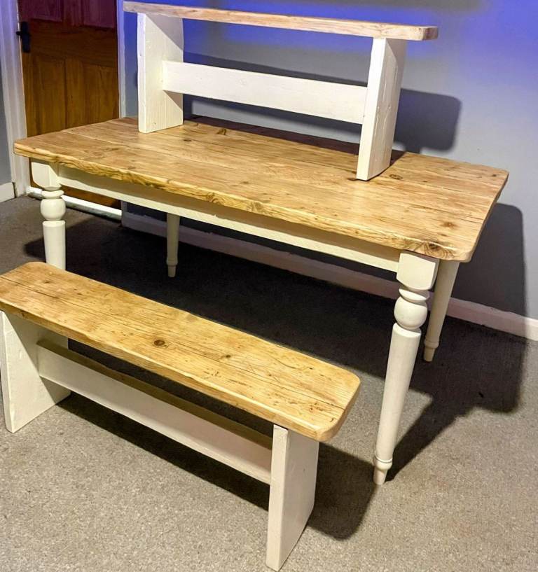 Hi we make stunning quality dining table sets out of quality reclaimed wood . We have a free set of benches offer at the moment we can paint in any colour at no additional cost . 4ft X 3ft versions are 350 5ft x3ft versions are 399 6 ft x 3ft versions are 450 7 fts and 8 fts are availableas well . Order at reclaimedtableworkshopdotcodotuk or contact us on here for you requirements