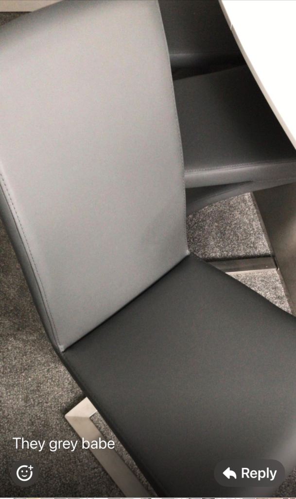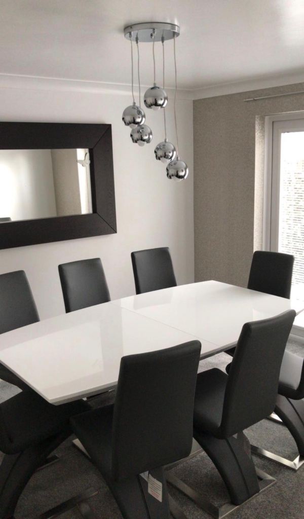 Oak furniture Richmond extendable table with 8 grey chairs. One chair foot needs sorting but hasn’t affected use for us. Was delivered like it. Large heavy table and smart looking.
