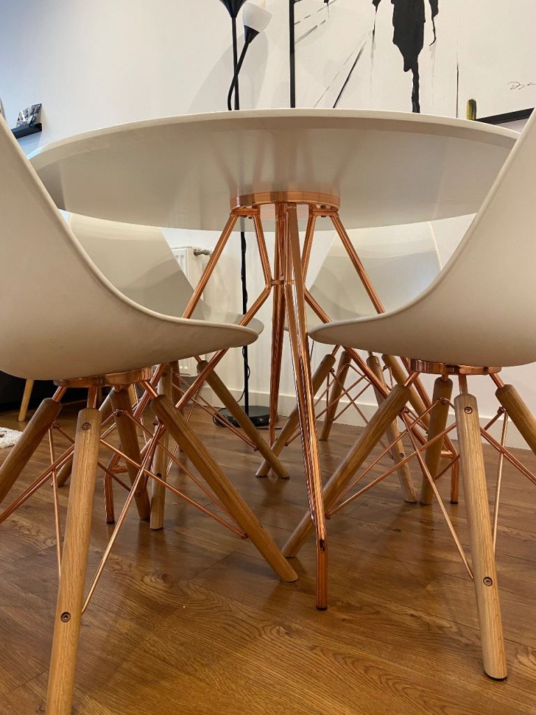 Modern round dining table (110 cm) with 4 matching white chairs with wooden legs and rose gold metal detailing.