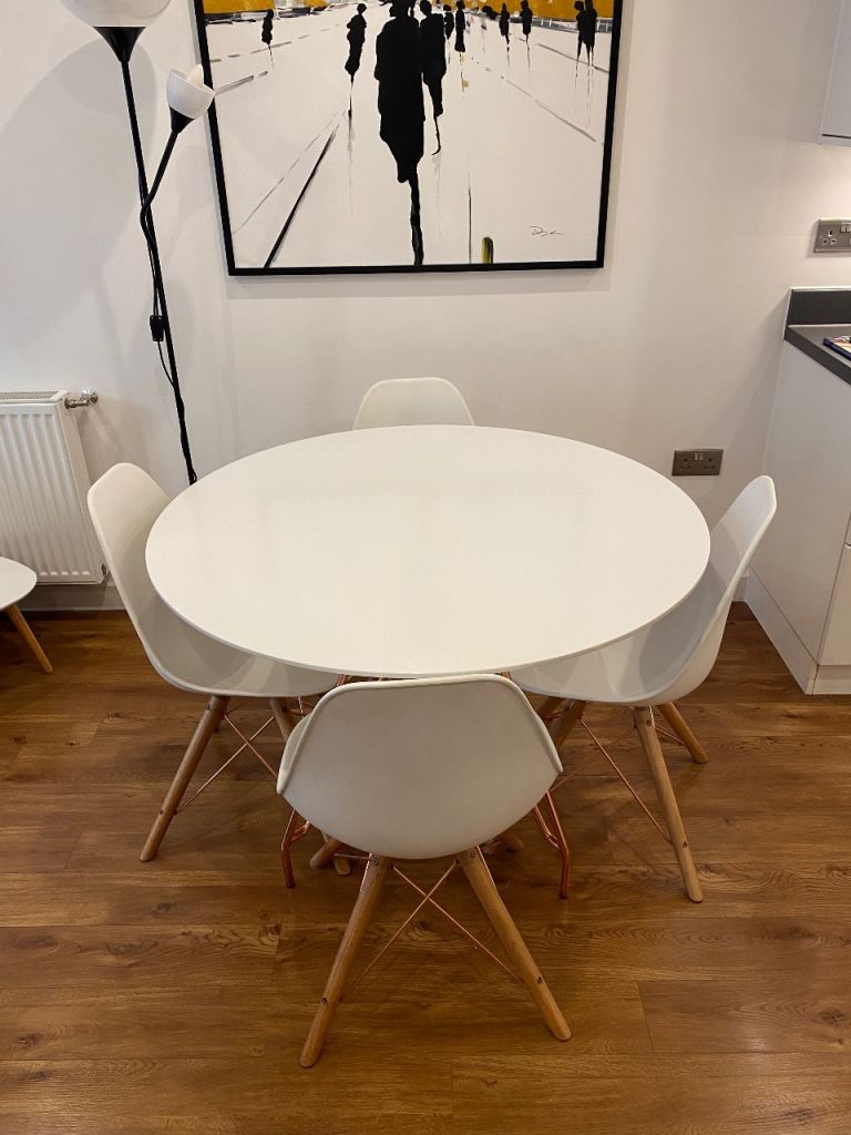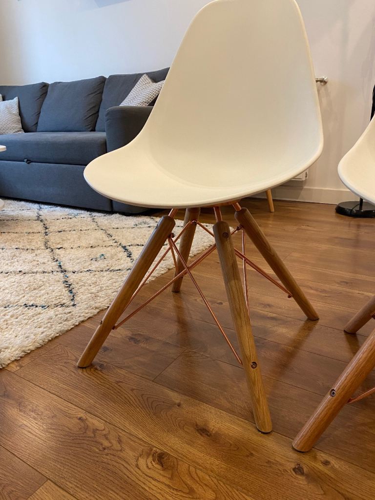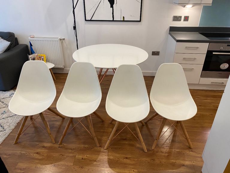 Posting for 10+ yearsRound Dining Table + 4 Eames Style Chairs – White / Wood / Copper