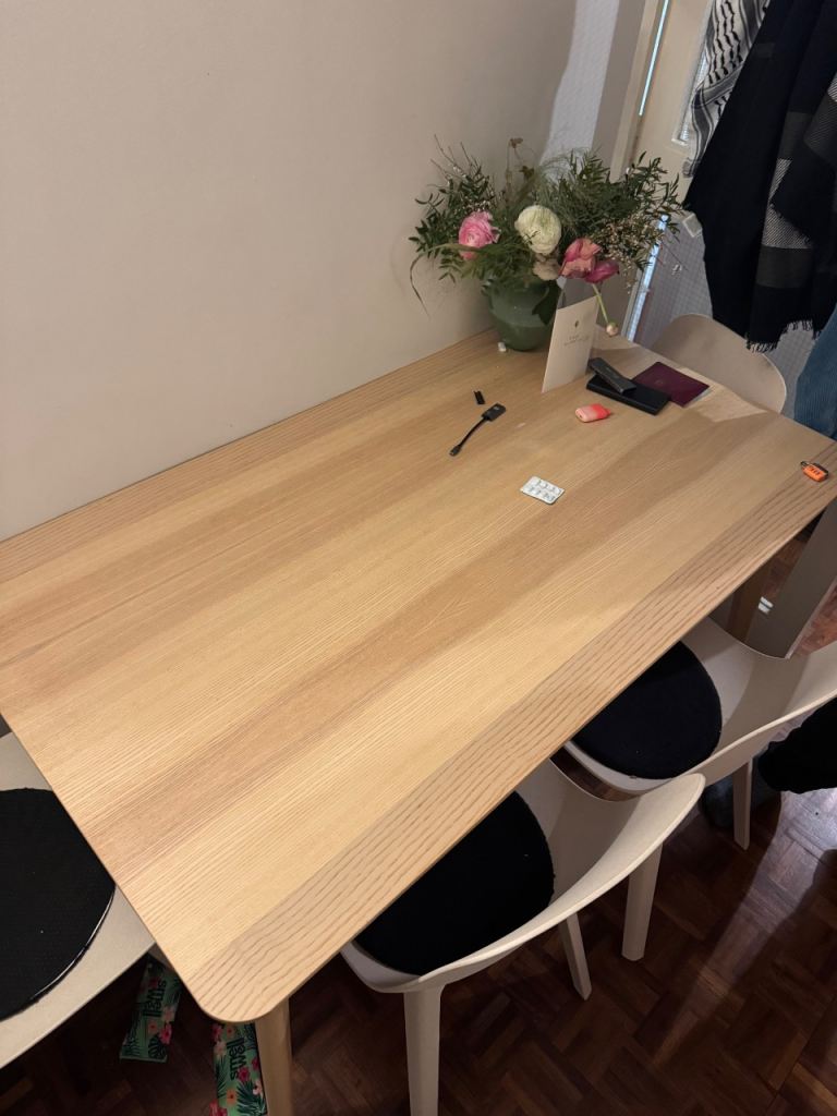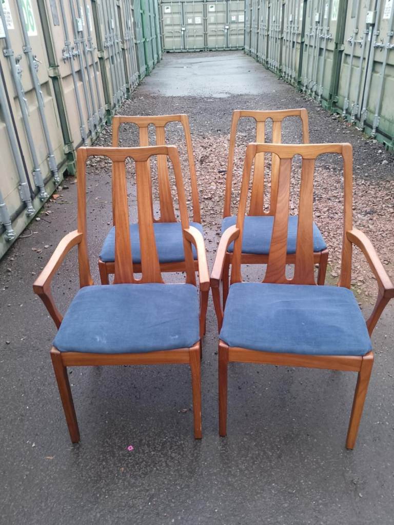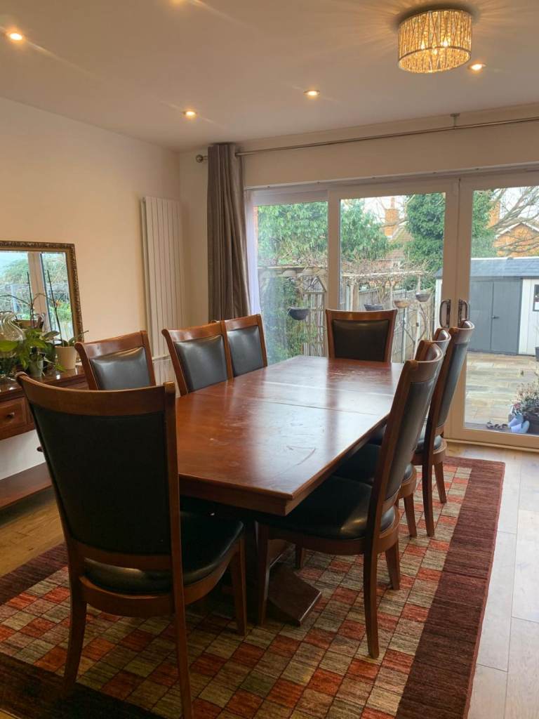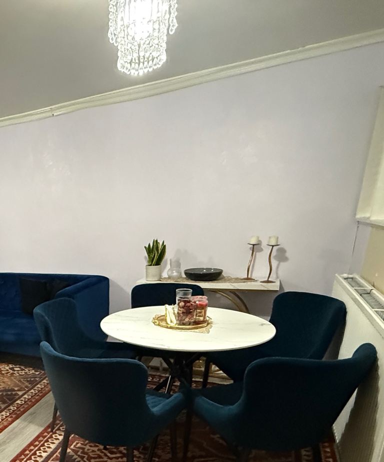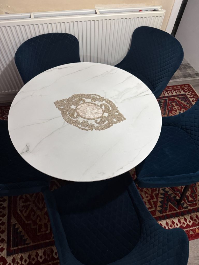 90/90cm round dining table with 5 blue velvet chairs good condition