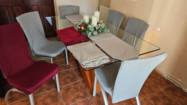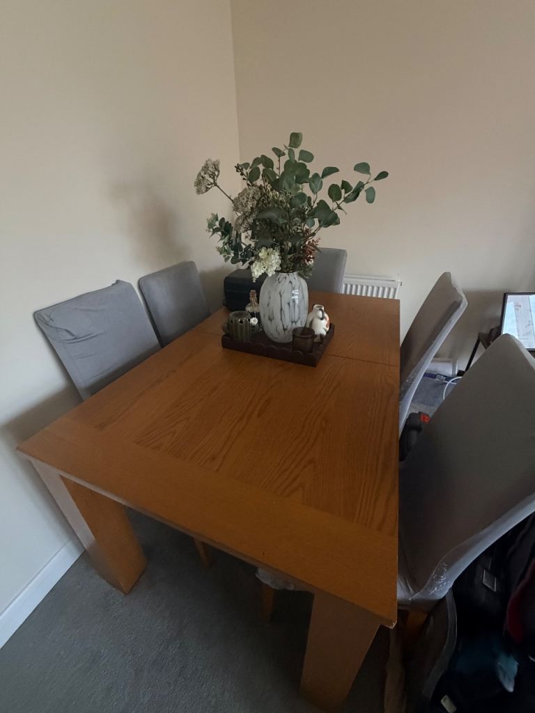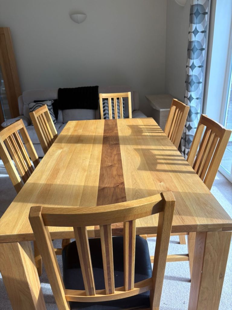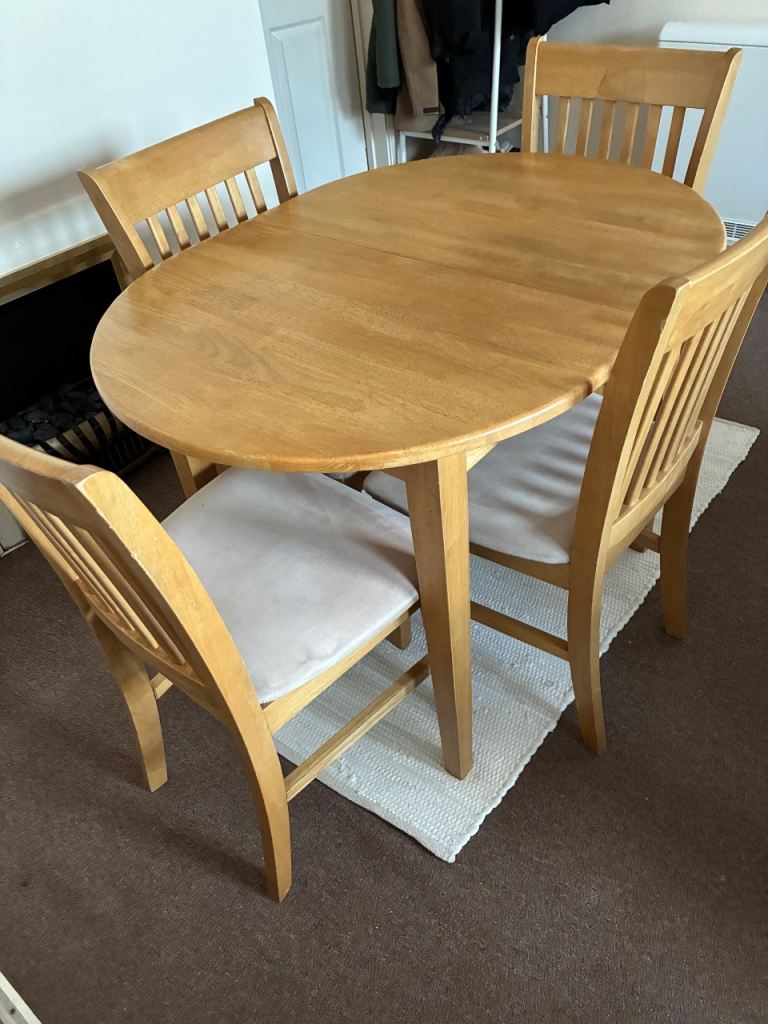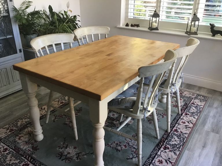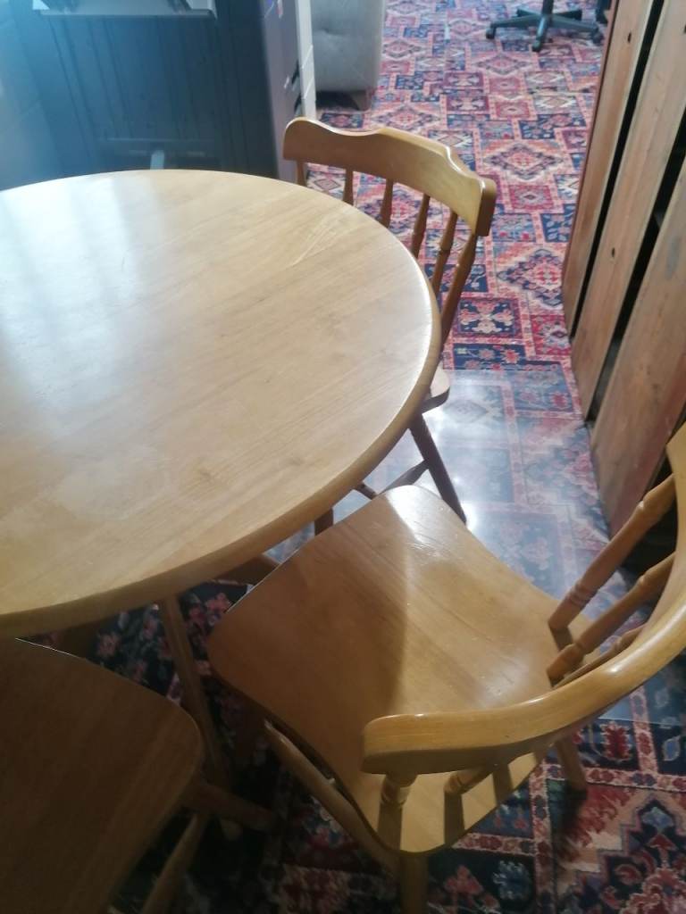 Excellent condition, light signs of use to chair legs, rush seats excellent. Table top very good.