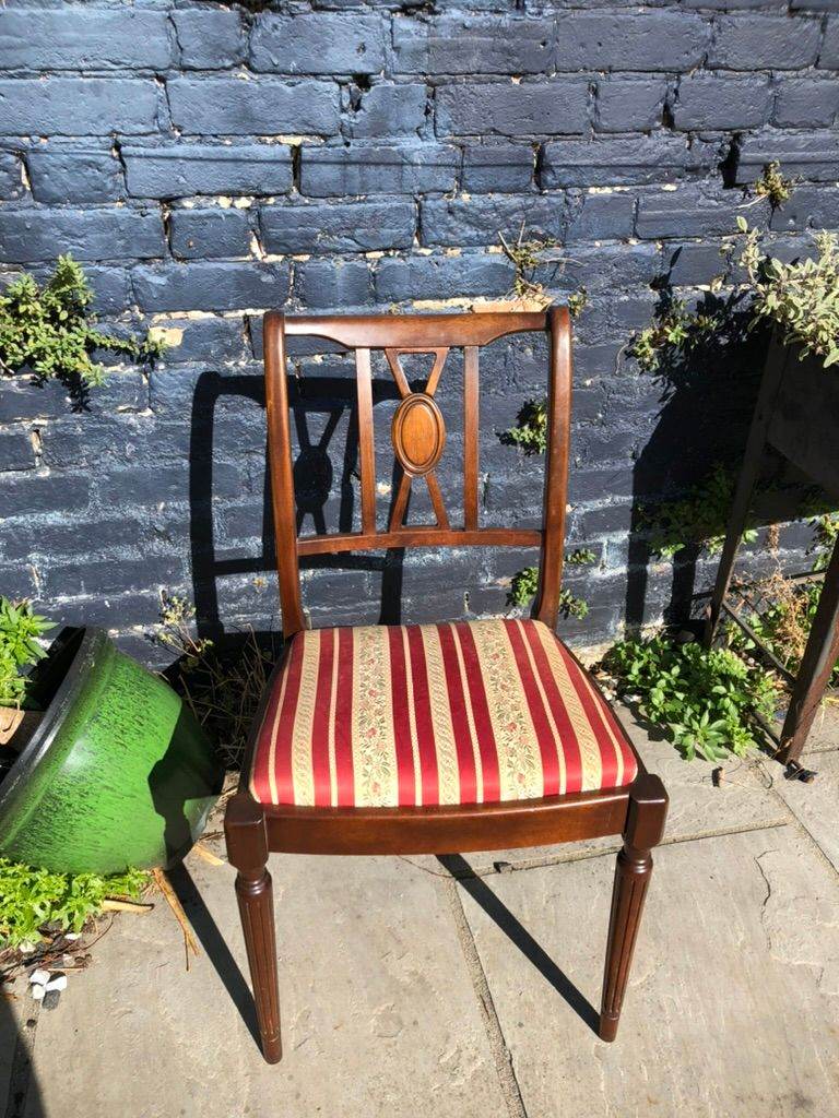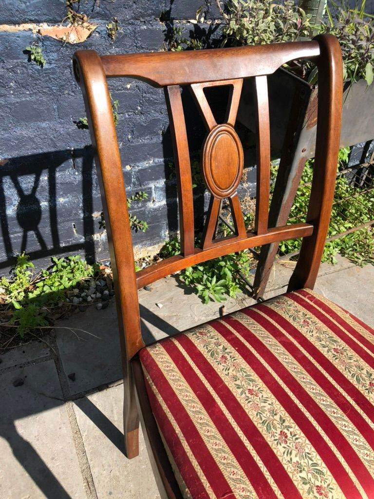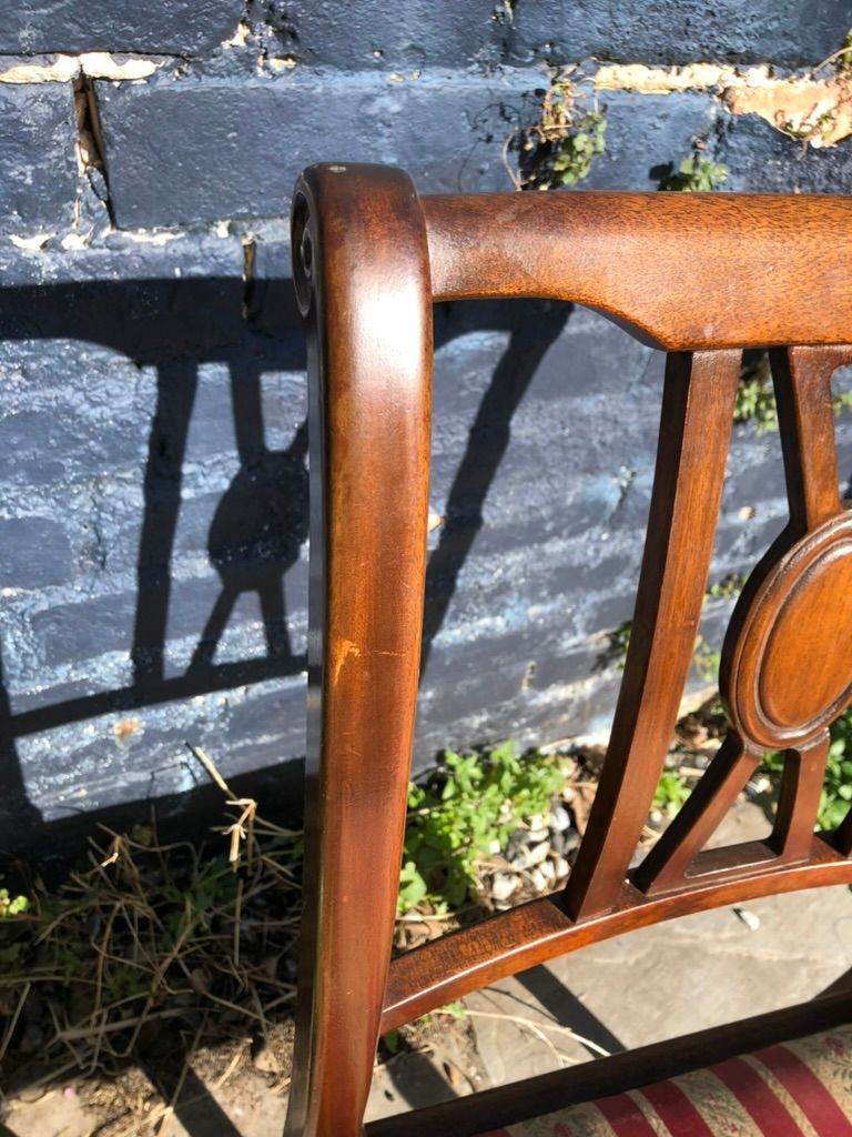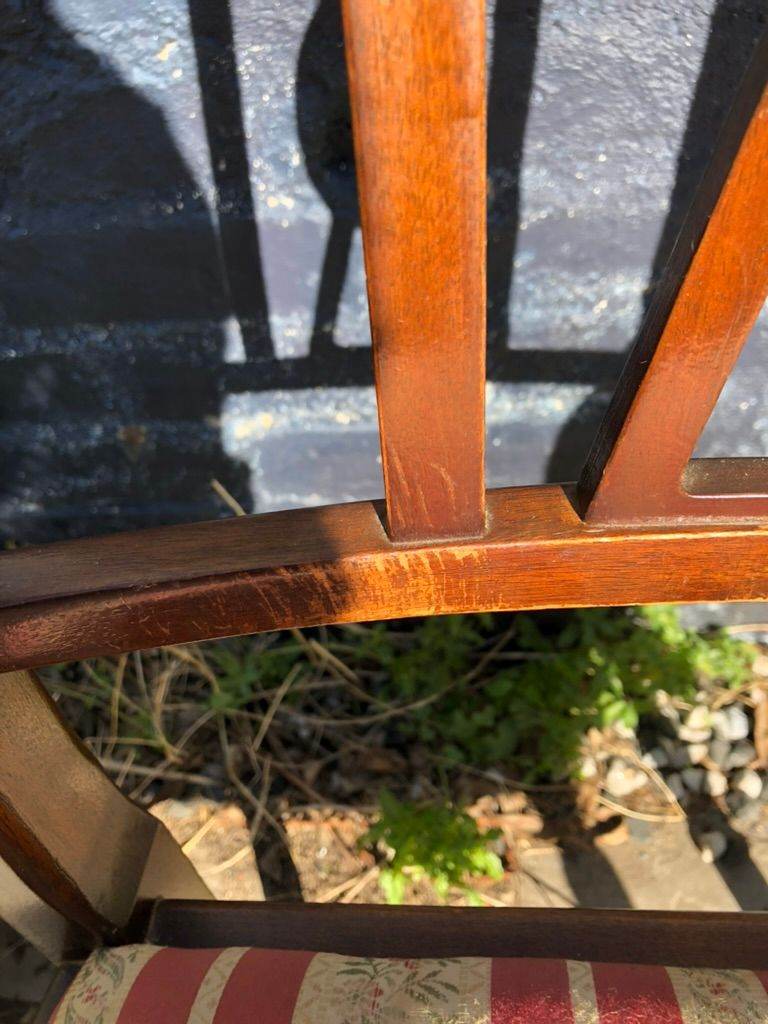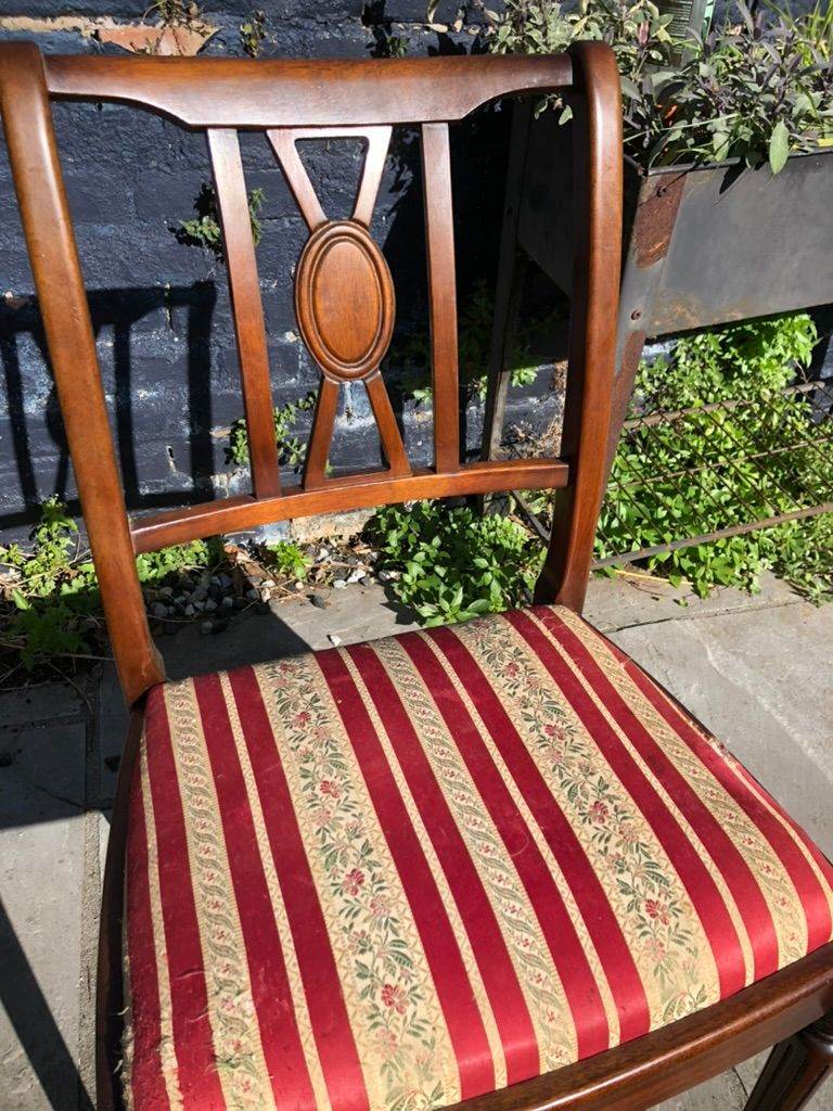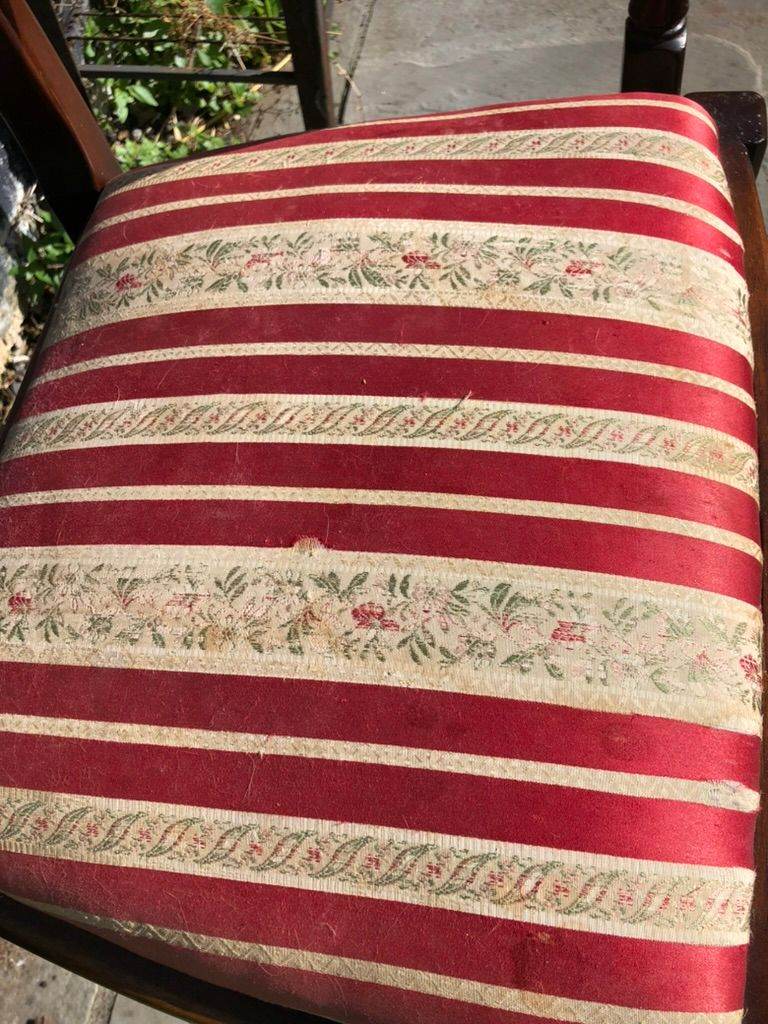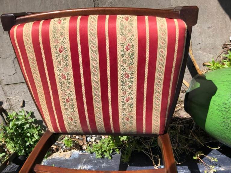 Six antique dining chairs. 2 carvers - 4 dining chairs. Wood in excellent condition - fabric in good condition. With drop in seats which make re-upholstering easy.