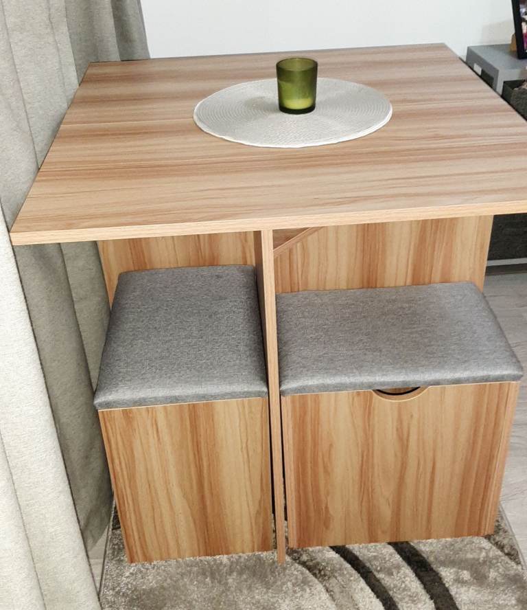 80cm by 80cm table with 4 storage seats and under table shelves. Only a year old, due to colour change in room in new house, no longer matches