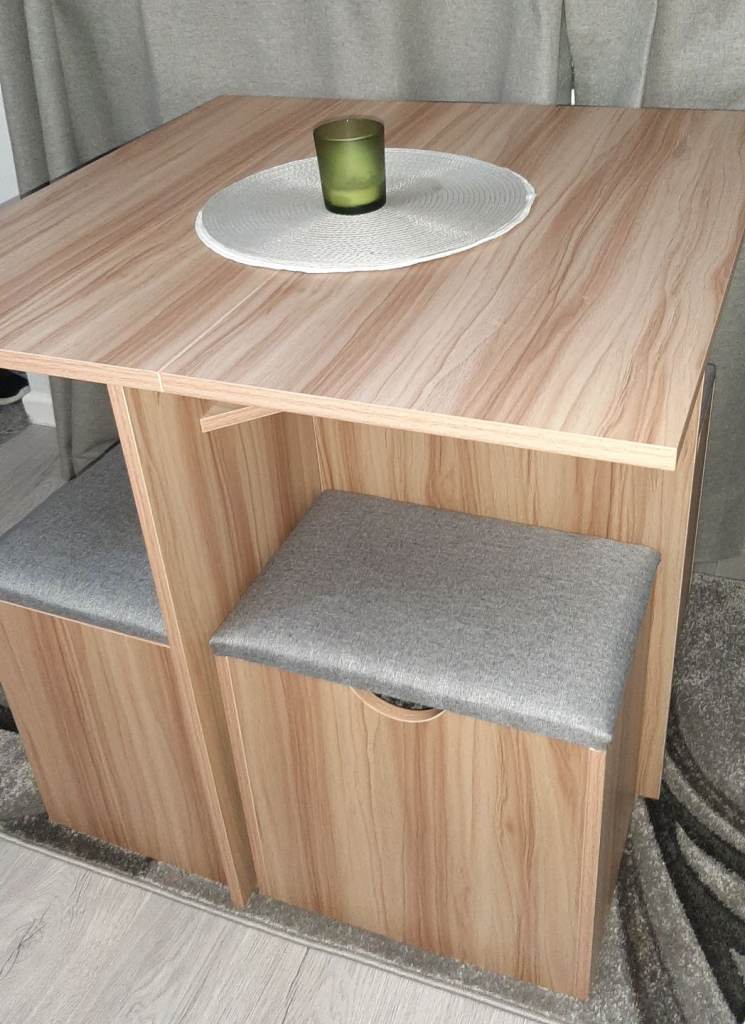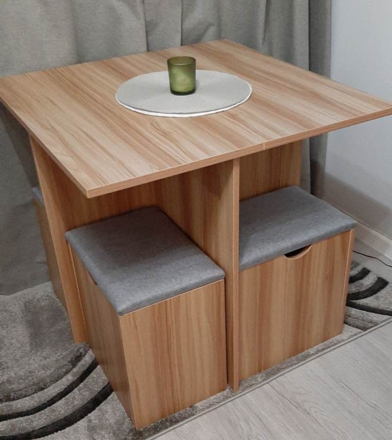 80cm by 80cm table with 4 storage seats and under table shelves. Excellent condition only a year old...changed decor in my new home, so no longer matches decor