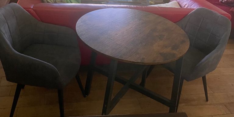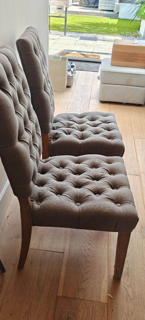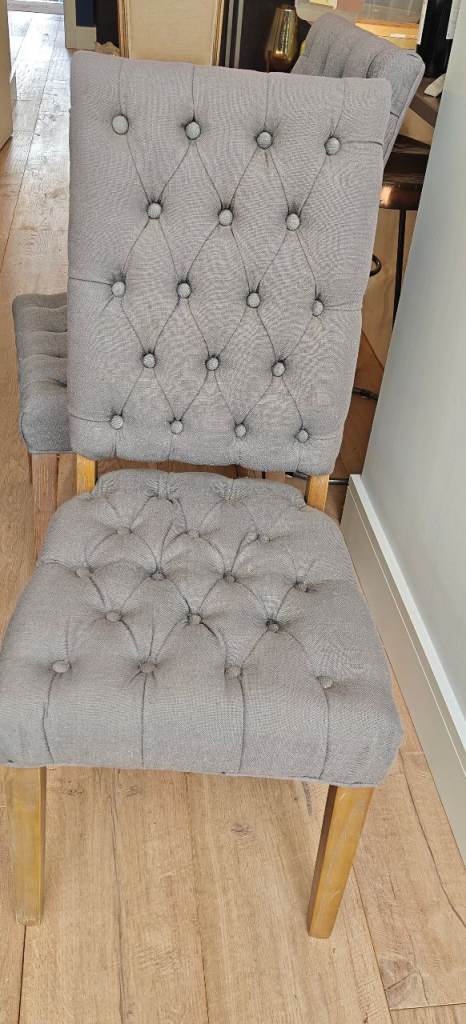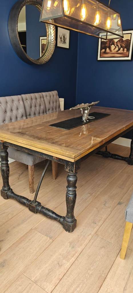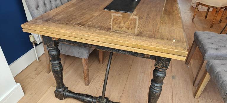 Barker & Stonehouse modern oak table 2m long, 1m wide with 50 cm extensions at each end. Seats 8, and 12 with extensions. Heavy oak table with distressed finish on legs. Cost £2200 and barely used. No marks, top as new. 6 grey fully upholstered comfortable dining chairs, very good condition. Clearing out due to house sale next week. Price for the complete set.