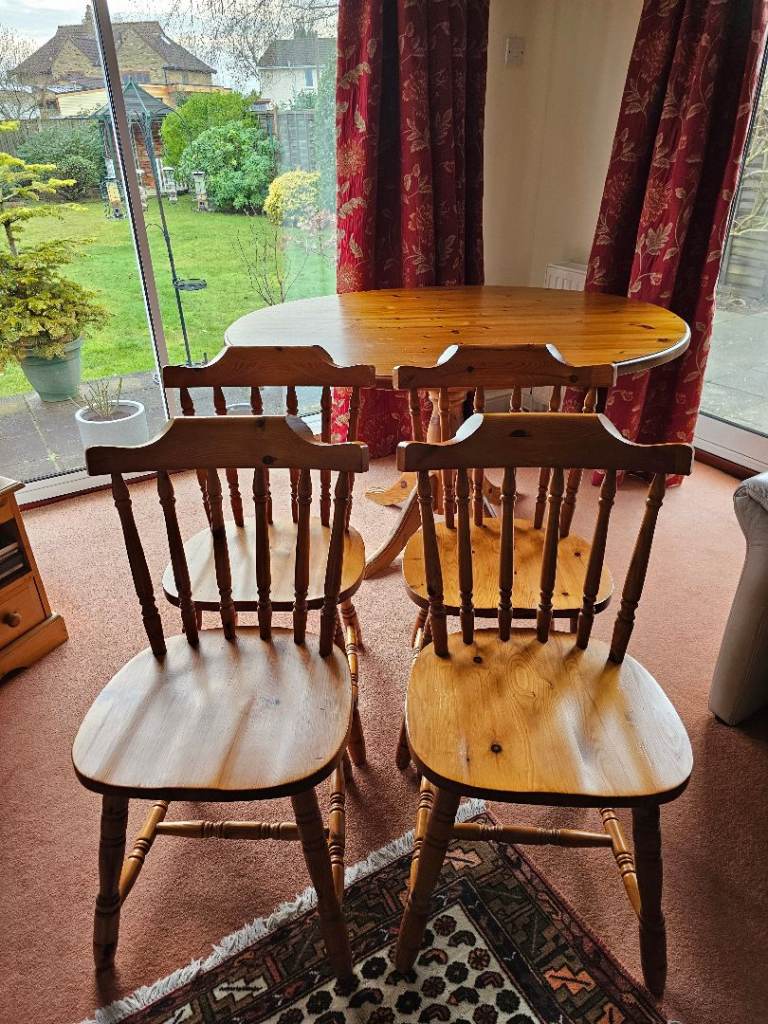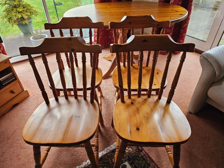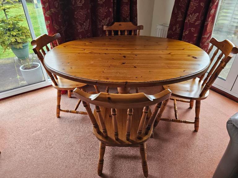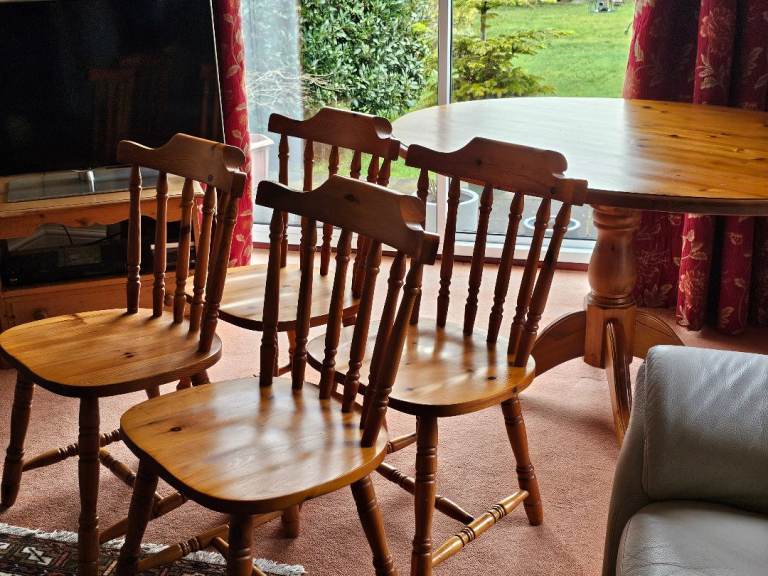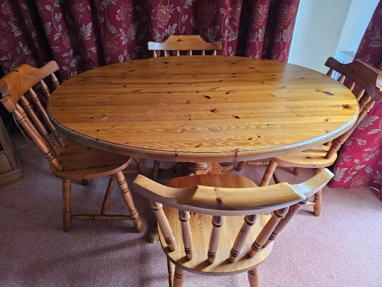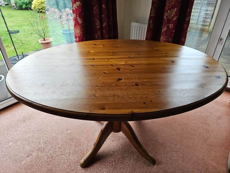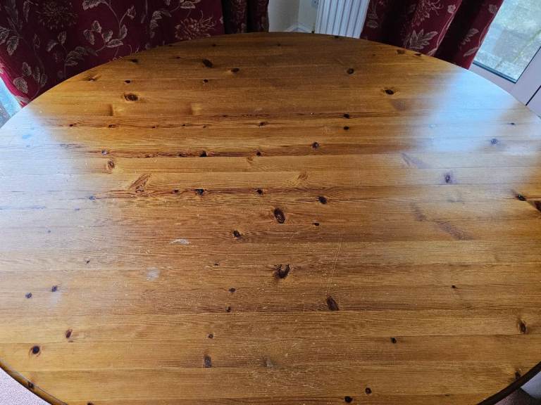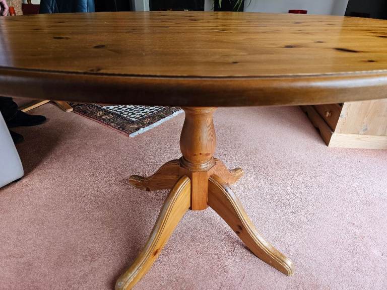 Very sturdy solid pine pedestal dining table and 4 chairs. Overall good condition but table top has some marks (see photos)