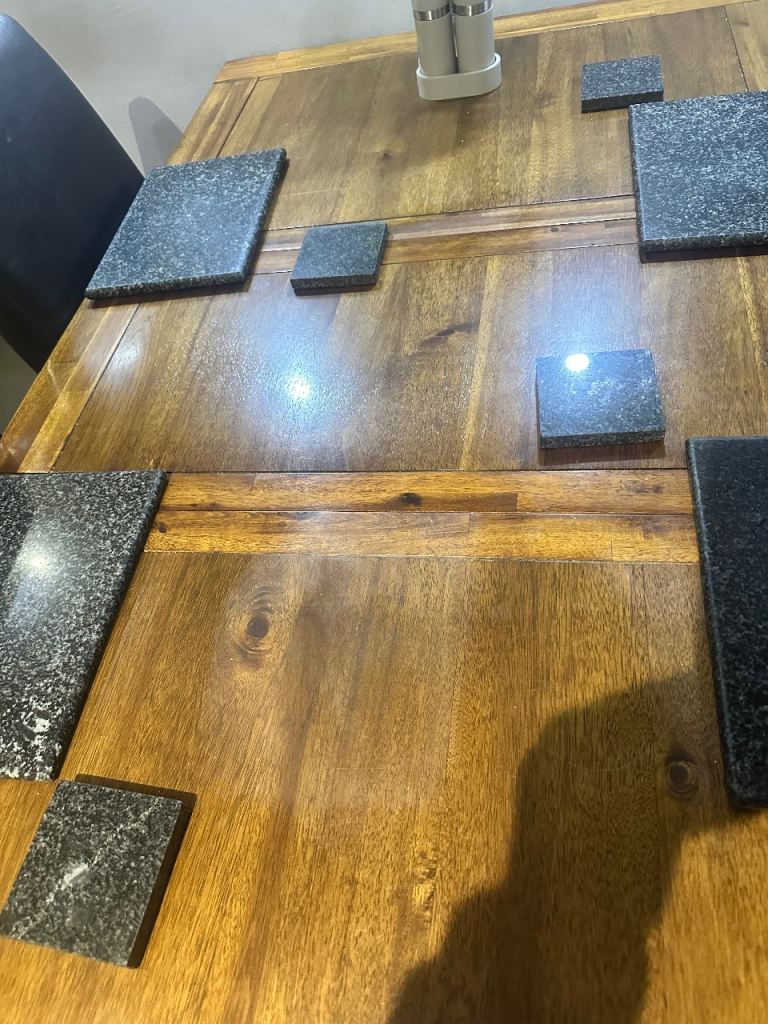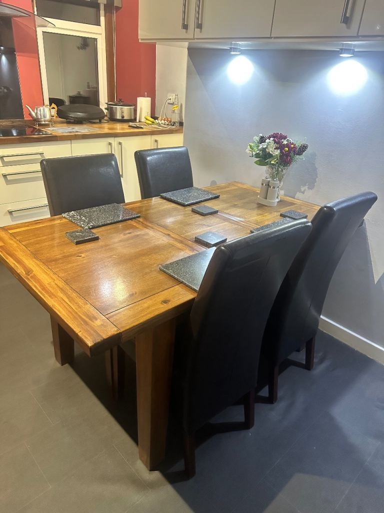 Solid wooden extending table and 4 faux leather chairs in excellent condition,table can dismantle for transport, lovely set new table forces sale.