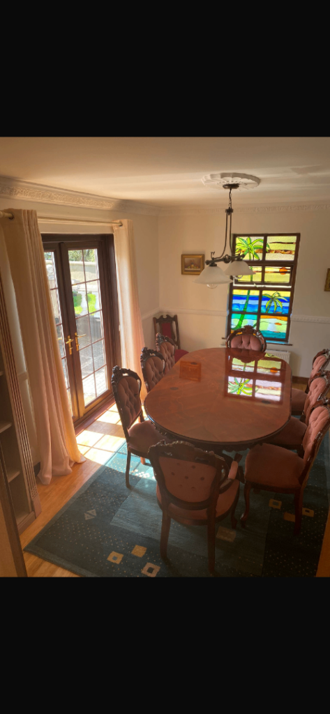 Posting for 3+ yearsSolid wood dining table & 8 matching chairs.