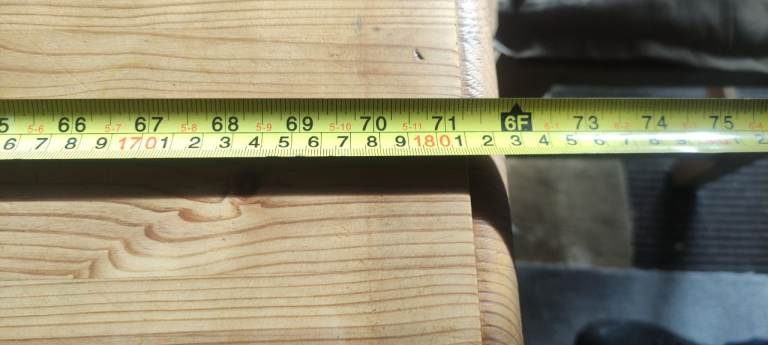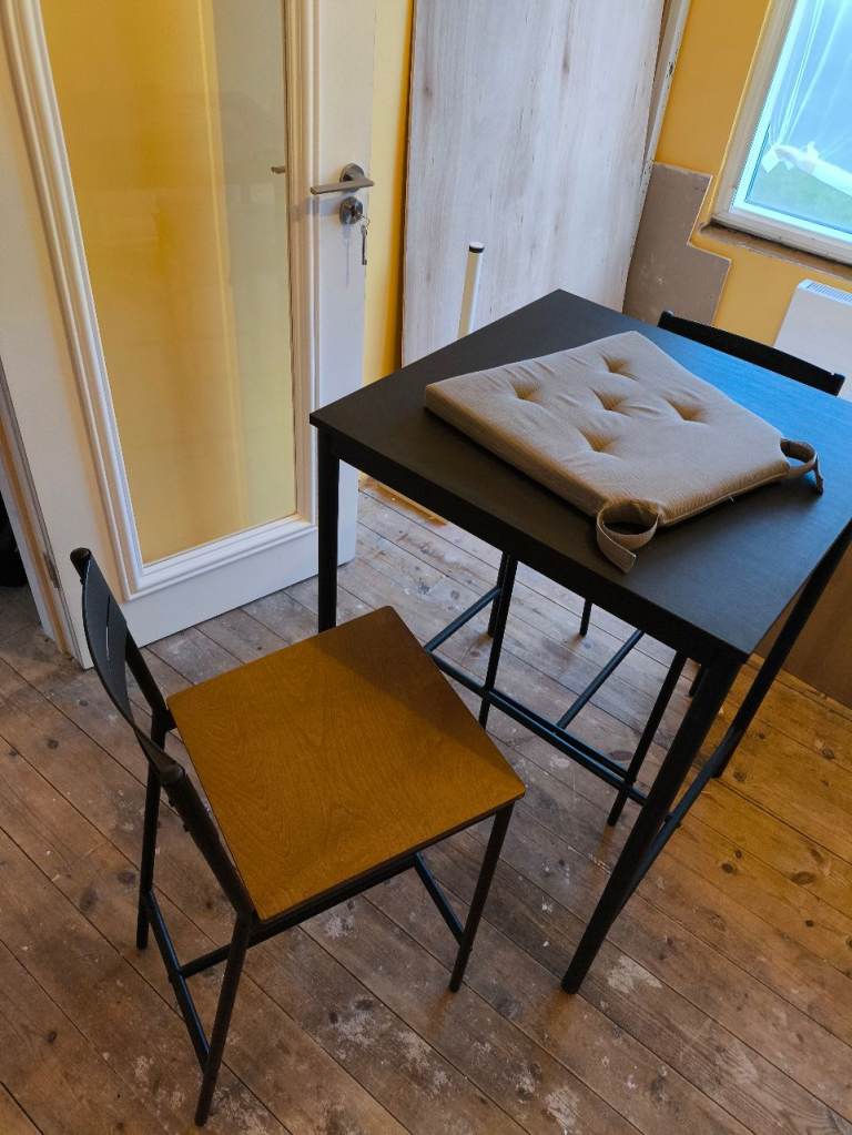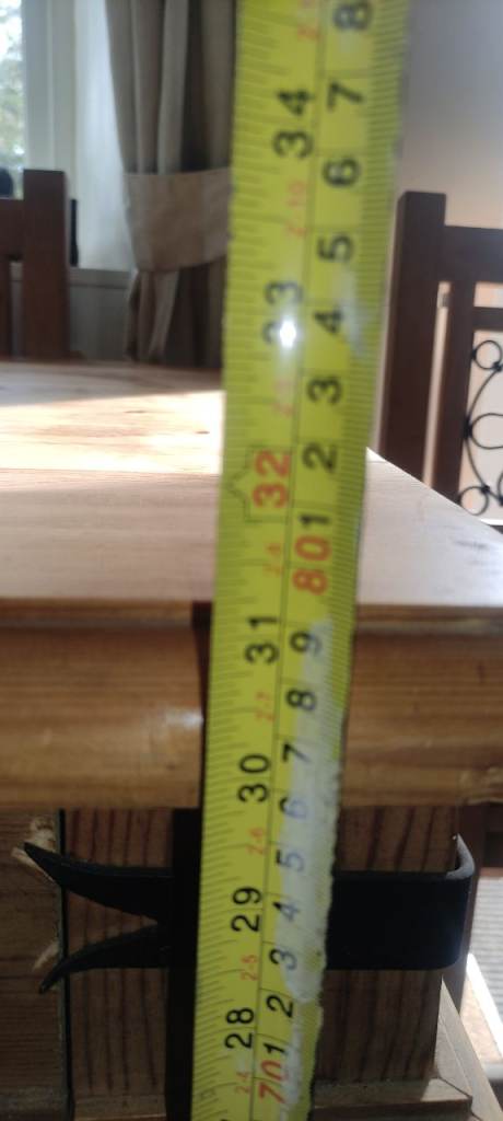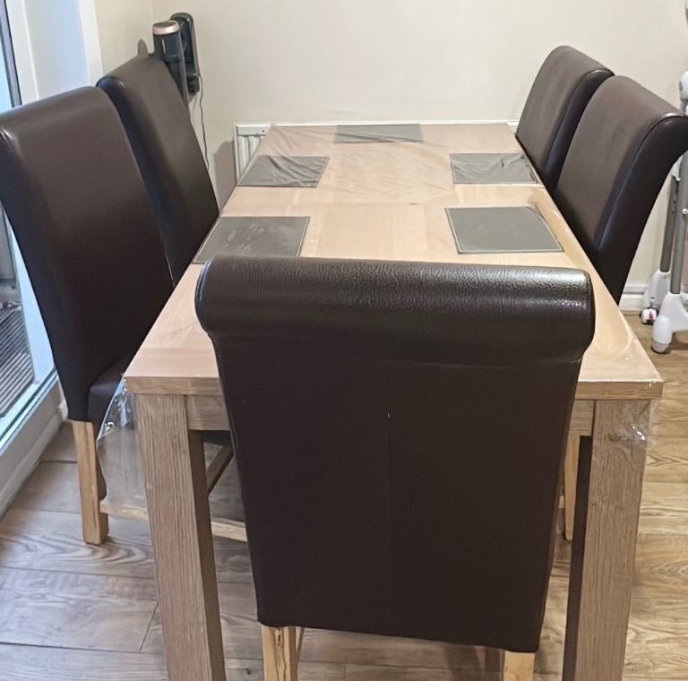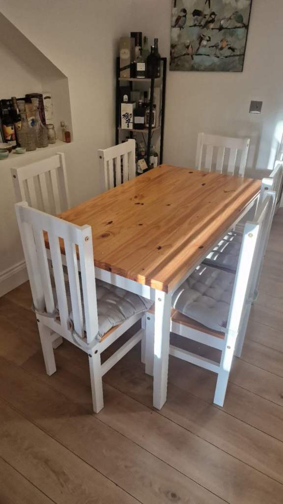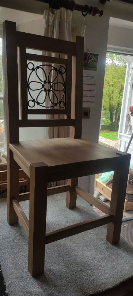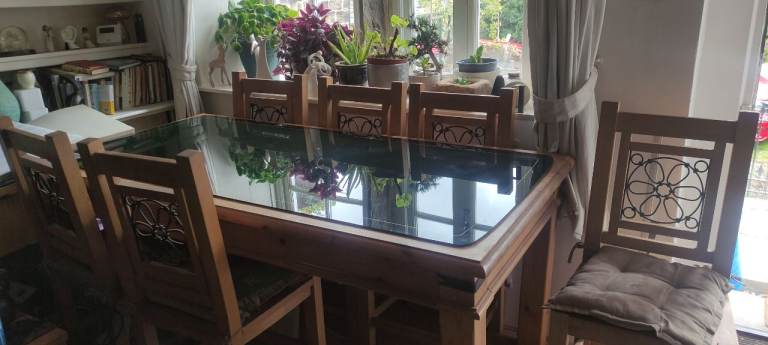 Lovely solid wood dining table (heavyweight pine) with decorative ironware and six matching solid wood chairs also with decorative ironware.