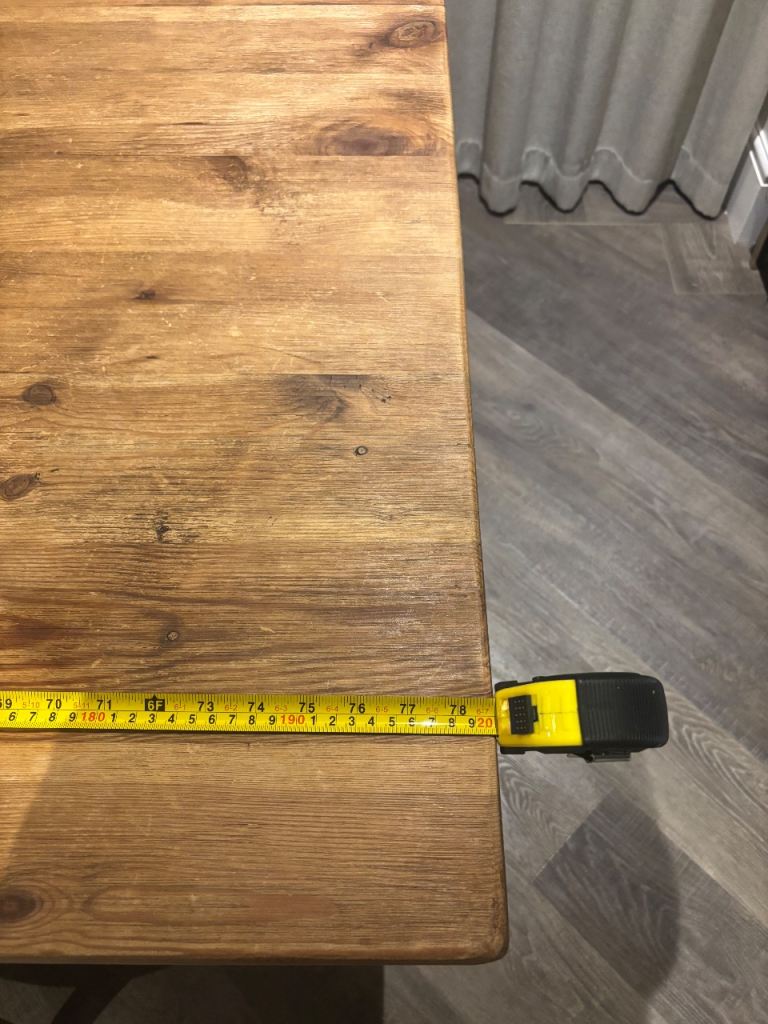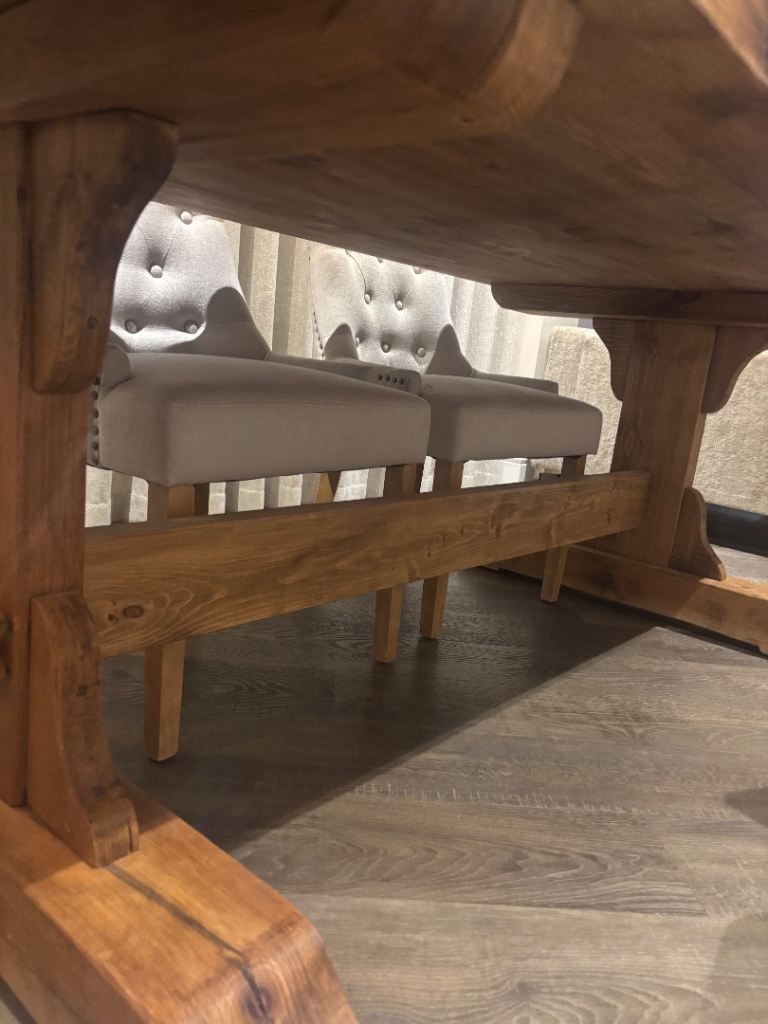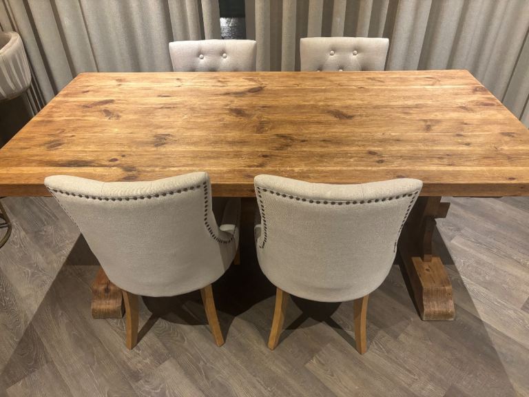 Beautiful solid wood dining table with a warm natural finish, paired with elegant upholstered dining chairs. The table is sturdy and well-made with a classic farmhouse/rustic style base, making it both practical and stylish.