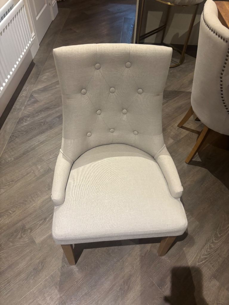 The chairs are upholstered in a neutral fabric with button-tufted backs and stud detailing, offering comfort and a timeless look that suits both modern and traditional interiors.