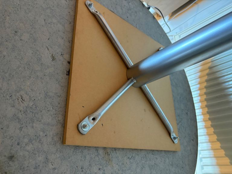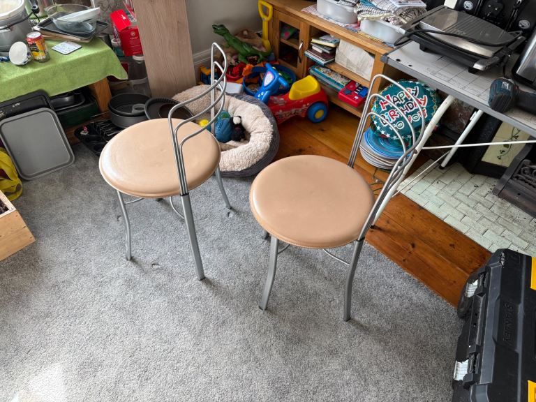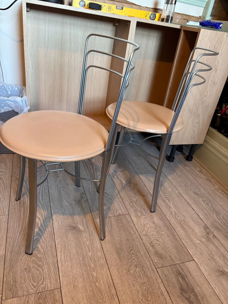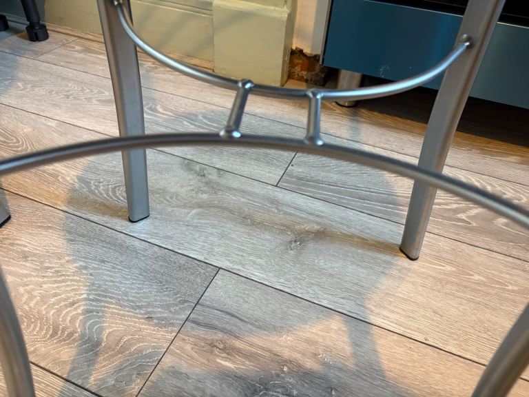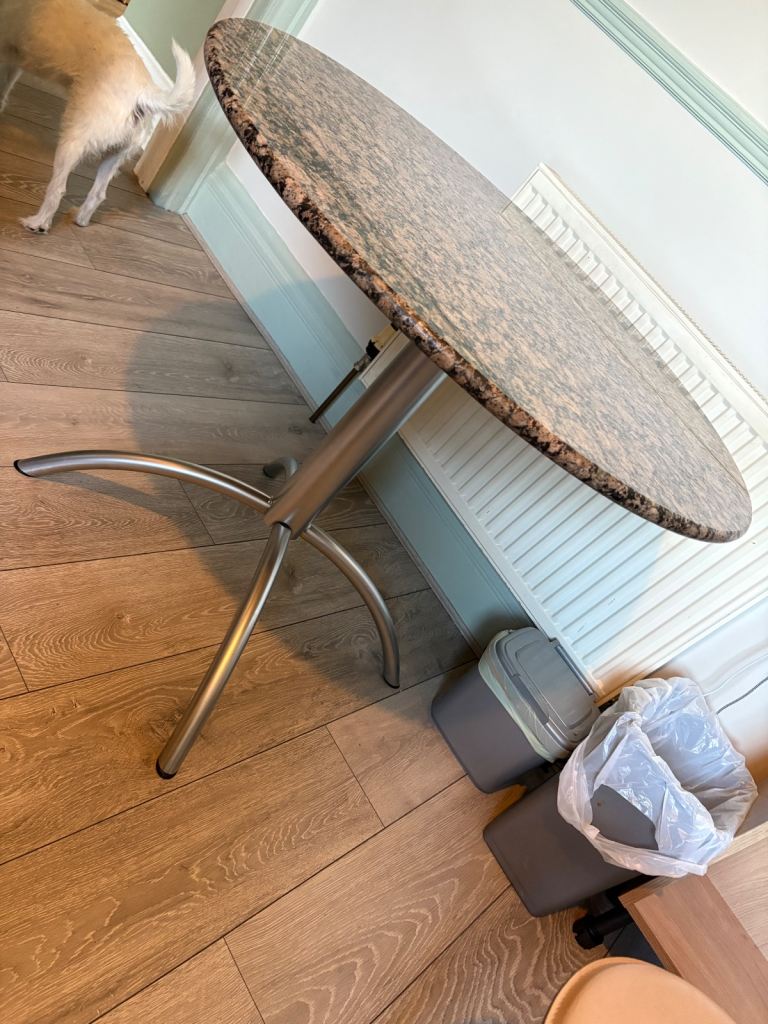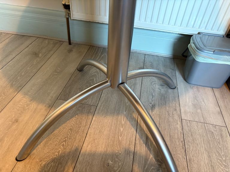 90cm diameter table, top made of Spanish marble. 4 chairs with a couple small marks on two of the seats. All in very nice condition. Originally from John Lewis @ £399