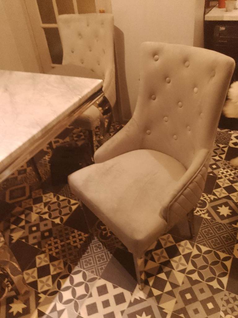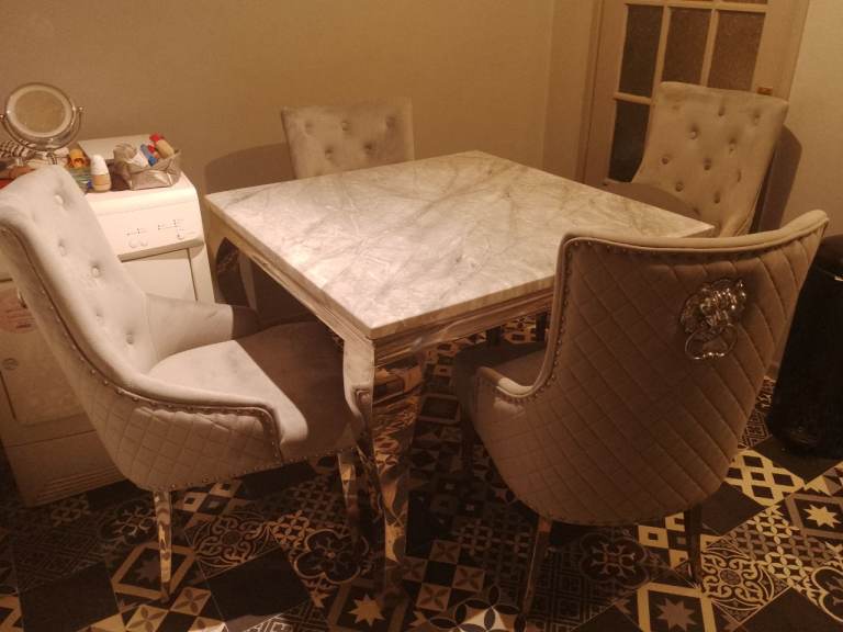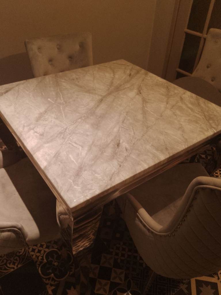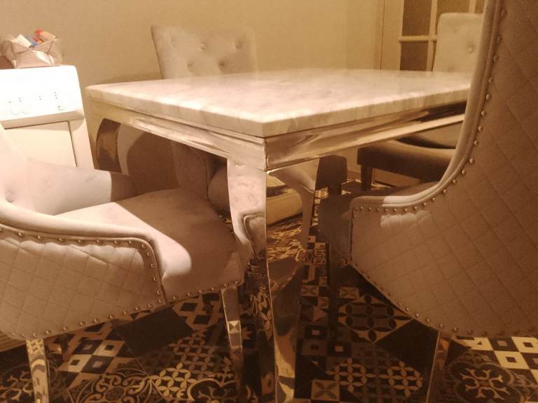 For sale beautiful marble table and chairs. Light to mid grey marble table with silver legs, 4 beautiful heavy chairs. Only 8 months old like brand new originally cost me £650.