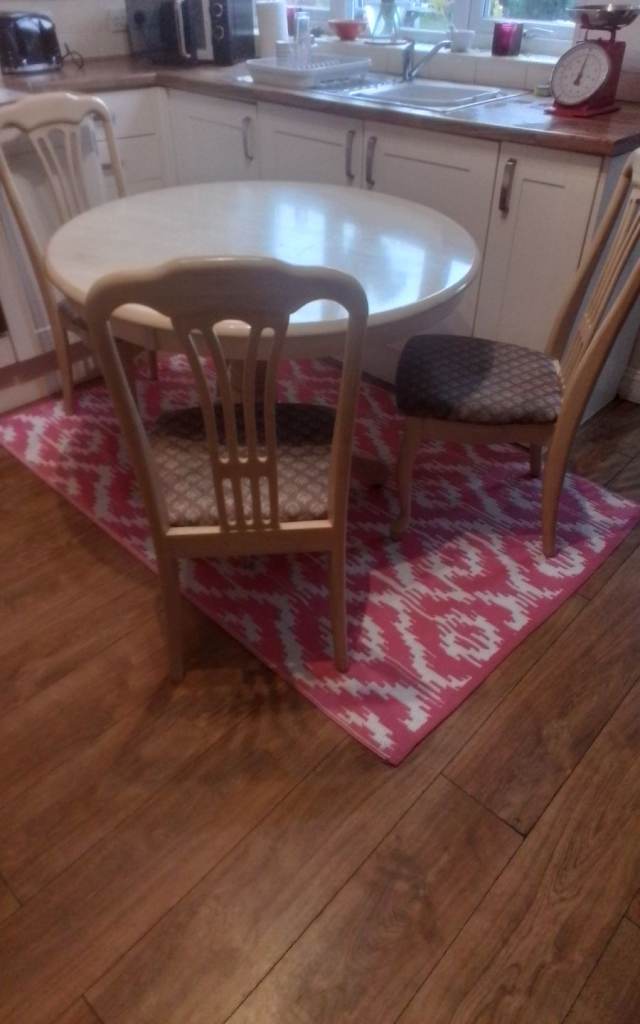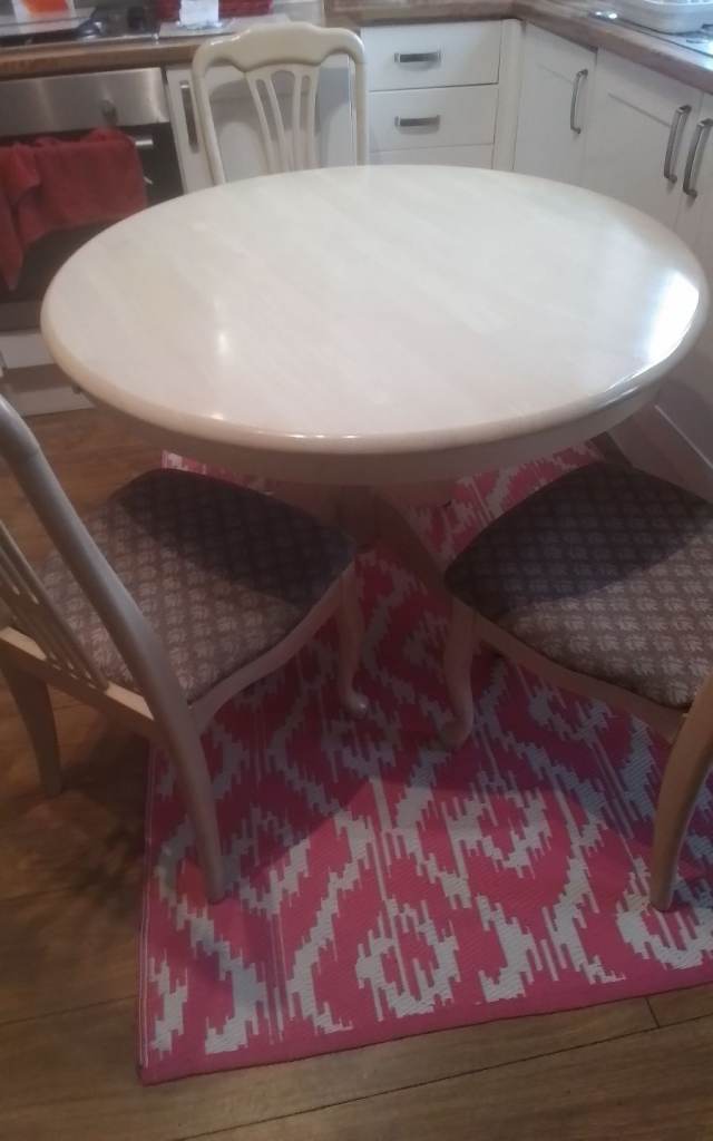 A lovely good quality circular kitchen table with 3 matching chairs in very good condition, the table is a beige/cream coloured and measures 75cm tall x 105cm in diameter, the 3 matching chairs are in good sturdy condition, a very stylish set, cash on collection from Wigan please or may be able to deliver for cost of fuel only thank you.