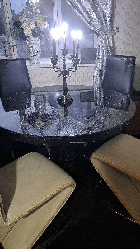 Marble table and 4 chairs. The chairs need received. Still solid chairs. That the resion i am only asking only £30. The table is very heavy