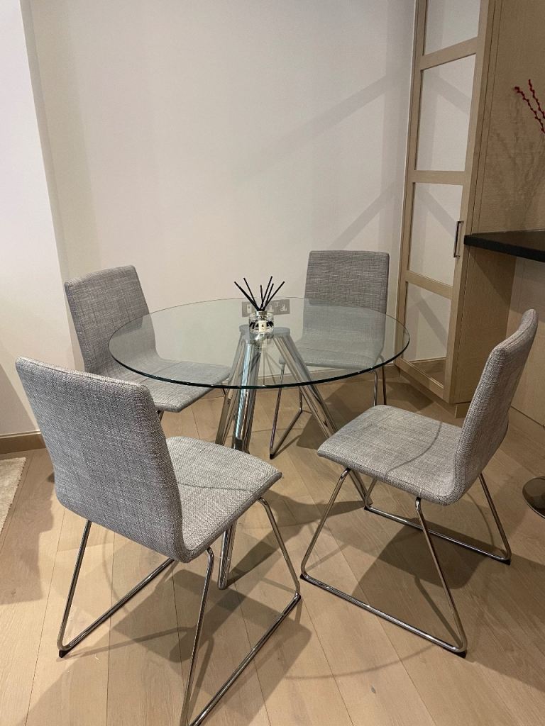 Glass dining table, circular with 1m diameter. Set of four chairs with grey fabric lining.