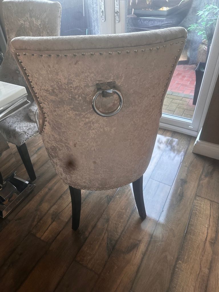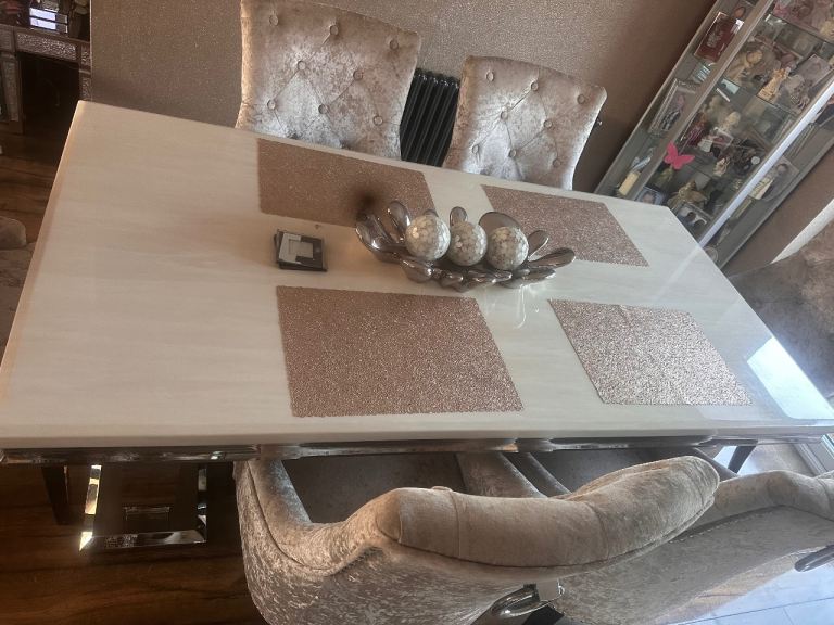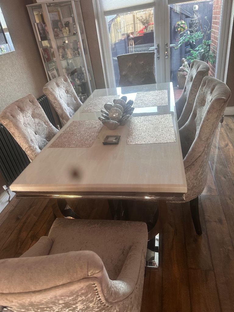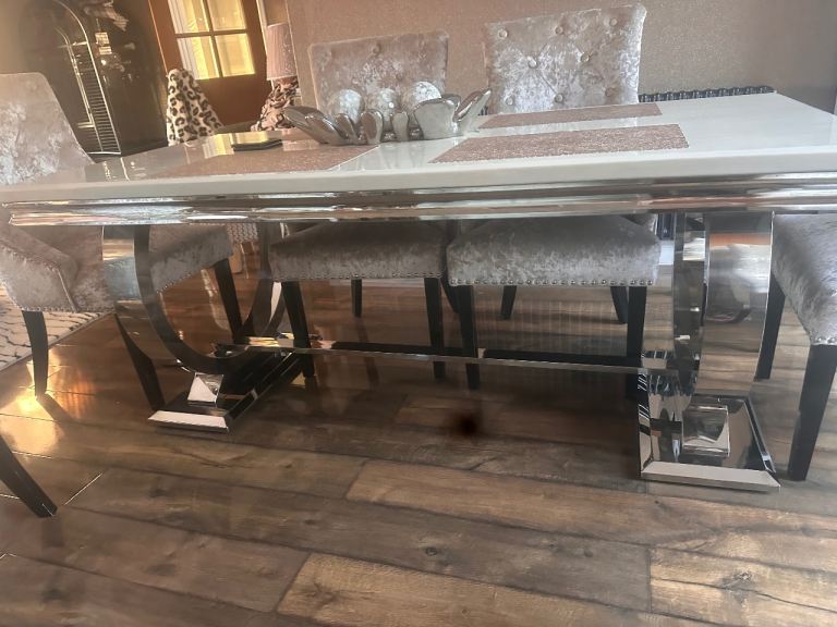 Really good condition few scratches that’s all dining table marble effect with 6 large chairs