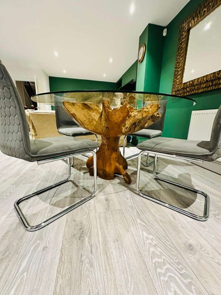 Posting for under a monthTeak Root Glass Dining Table with 4 chairs – One of a Kind