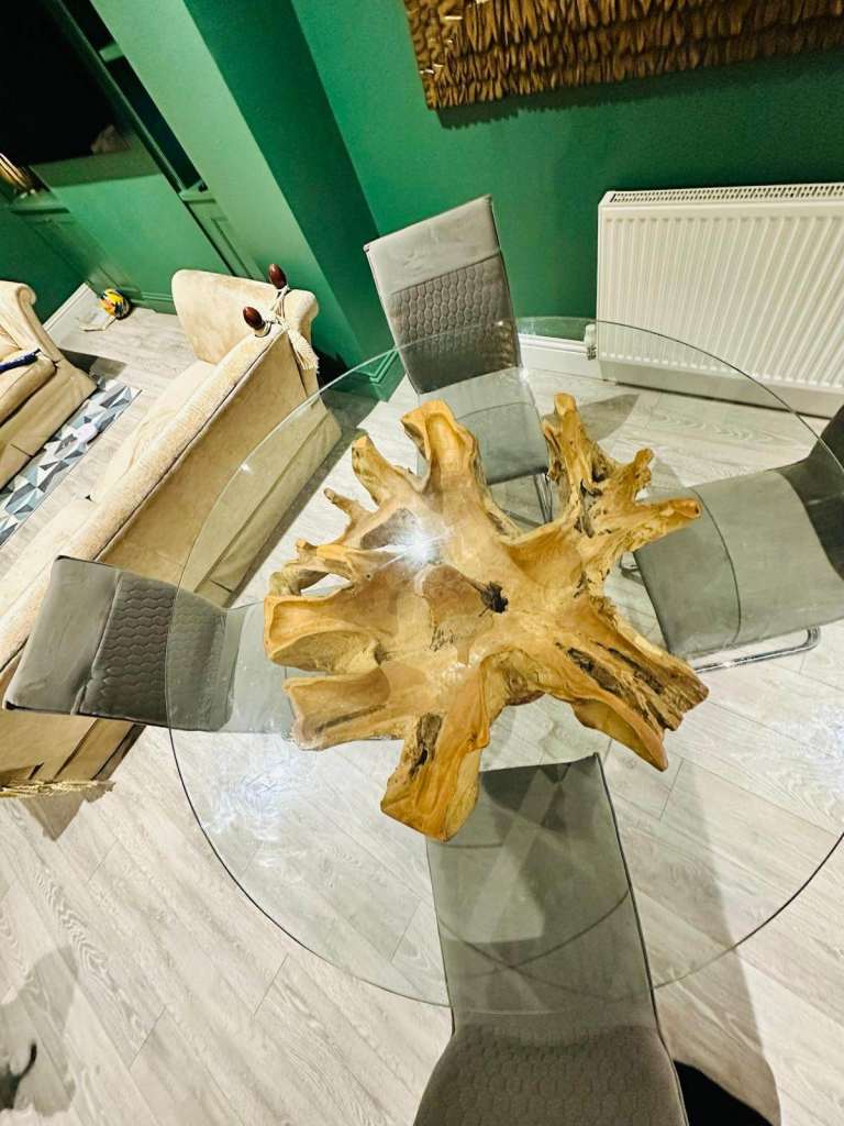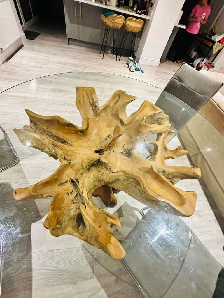 This is a stunning, one-of-a-kind dining table featuring a solid natural teak root base topped with a large circular tempered glass surface. A true statement piece that instantly elevates any modern or contemporary dining space. The design intentionally keeps the natural, irregular shape of the tree root. Natural variations, textures, and inclusions in the wood are intentional and part of the design, not defects. Honey-gold colour, Dense, smooth grain. This is a hand-made table, not mass-produced.