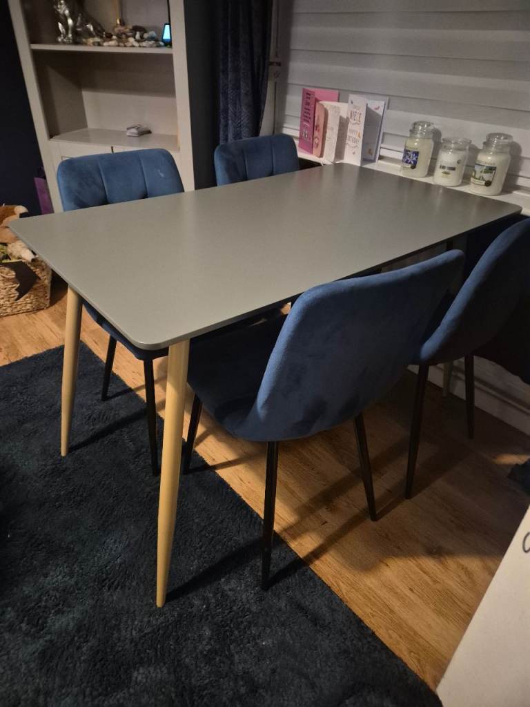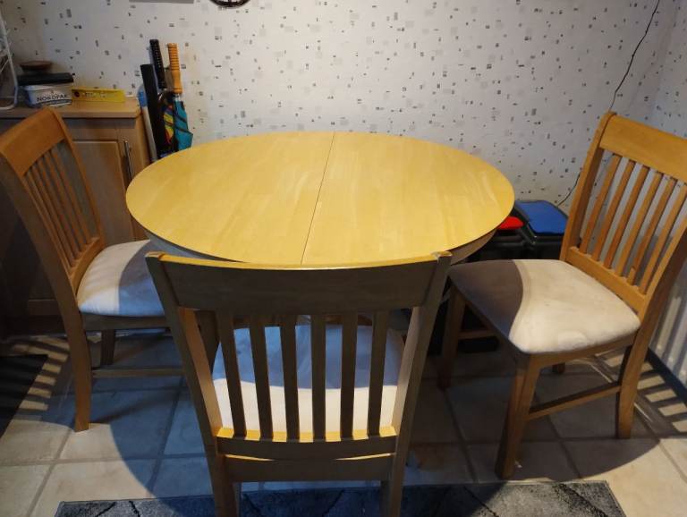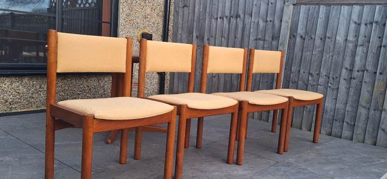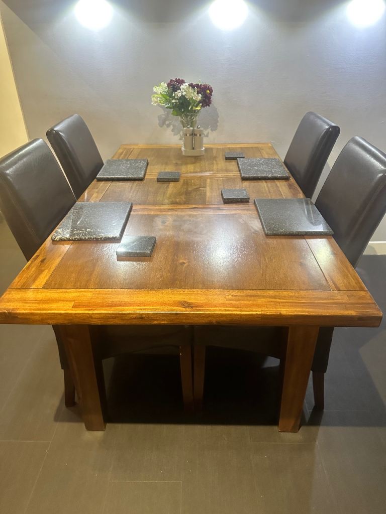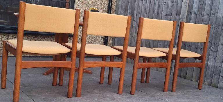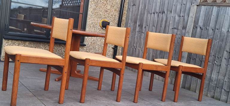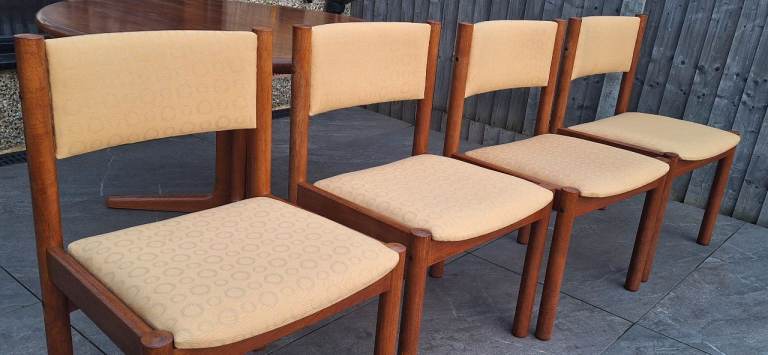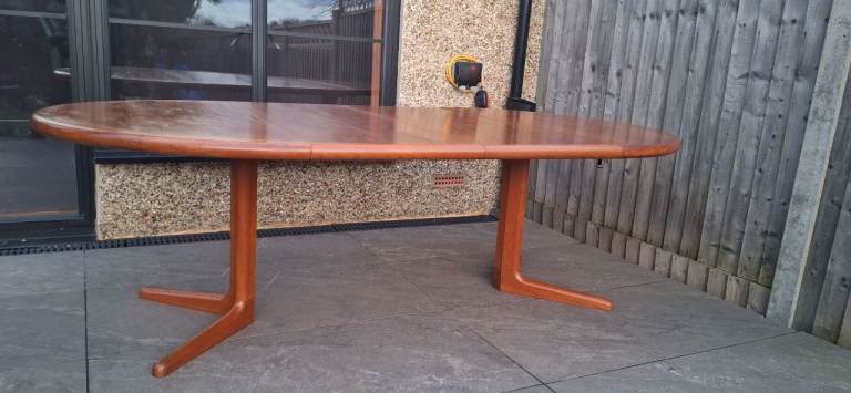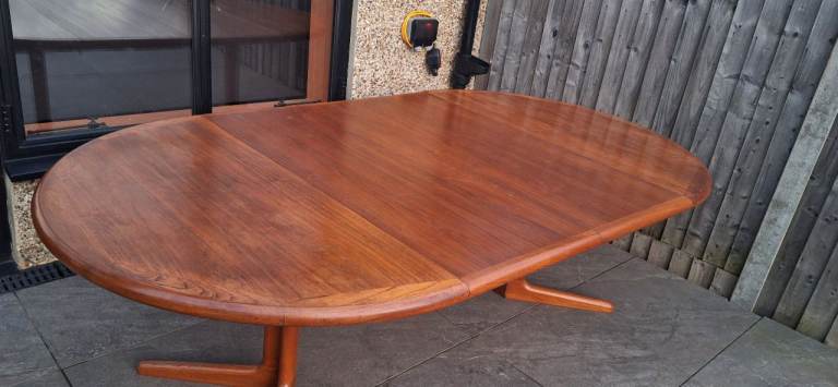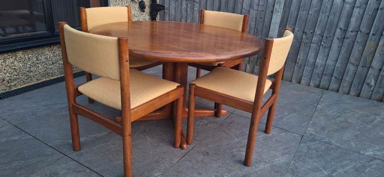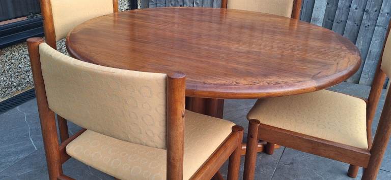 Danish table and chairs by Edvard Valentisen. The table has 2 extention parts. They have been restored, and the solid teak chairs reupholsered. The table has been cleaned and waxed. The main table top is slightly faded compared to the extending parts.