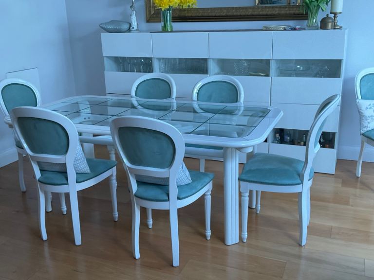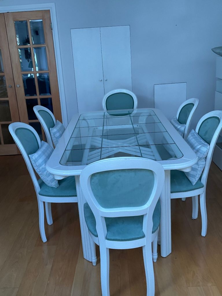 Clean and sturdy bedevilled glass topped dining table . Easy to clean and maintain. Gloss white wood.Buyer collects.chairs included.Dimensions 190cm long 99cm wide 74cm High.