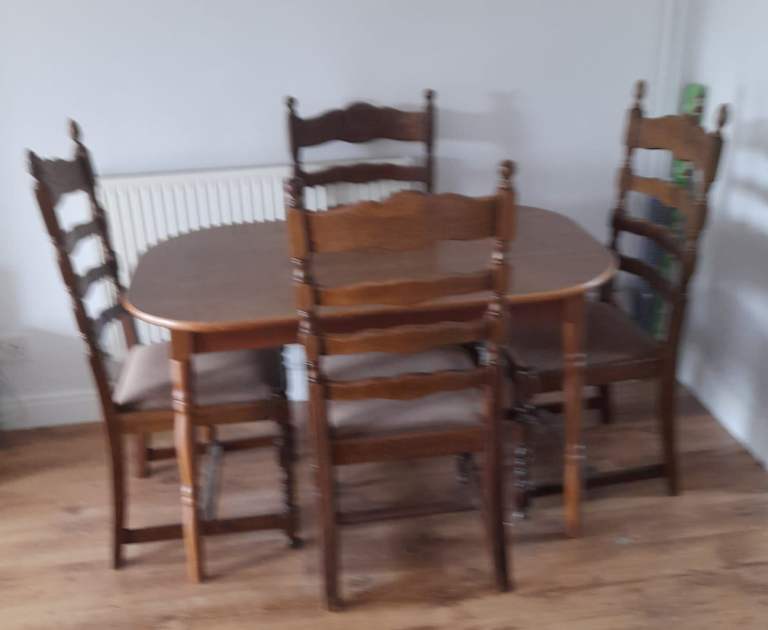 Lovely solid wood dining set with an oval table and four matching chairs.