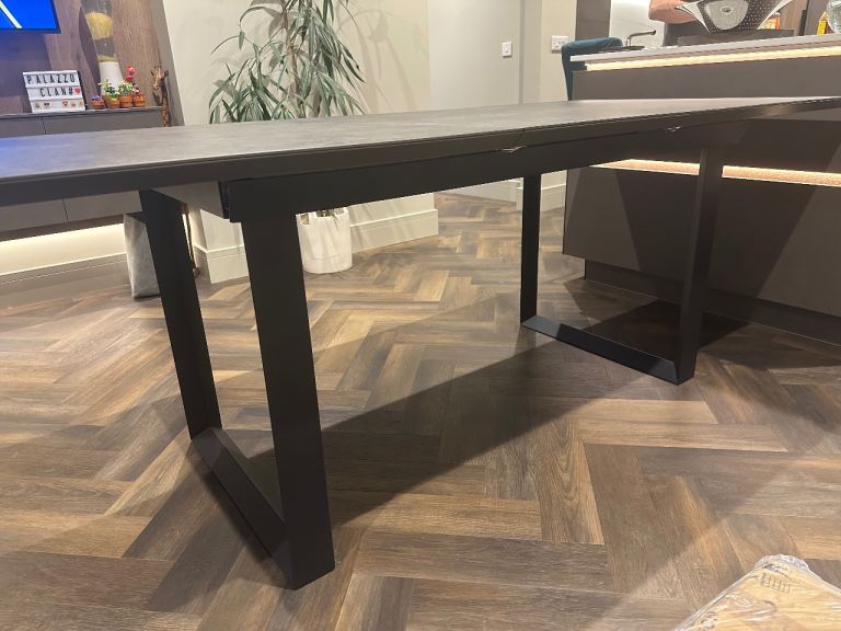 Thick and large wooden table with removable legs, four leather chairs.