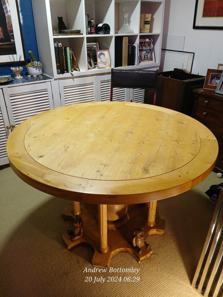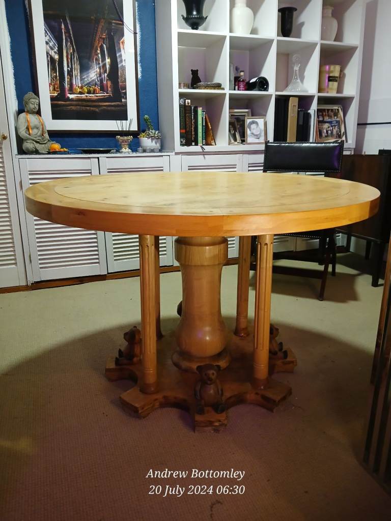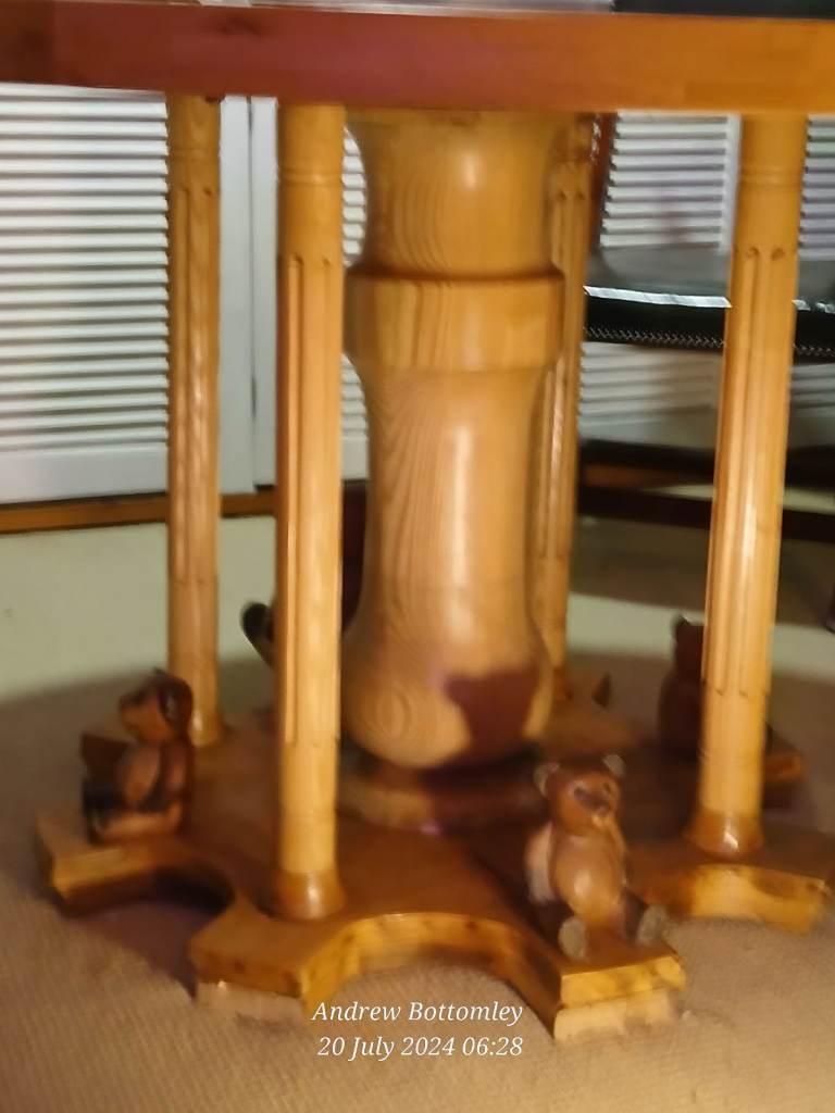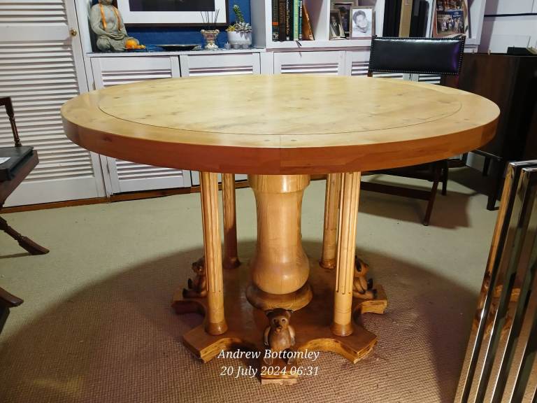 Quirky wooden Teddy Bears ( Mum and threeBespoke Oak Dining table seating upto six. 120cm diameter.
