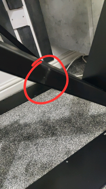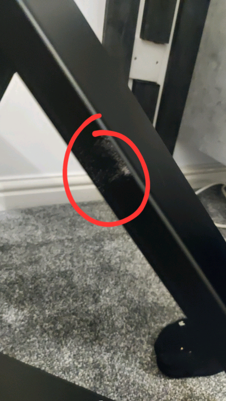 They have a slight mark on both legs, not very visible. These are shown pictures and no screws. They are simple to attach with 20 screws.